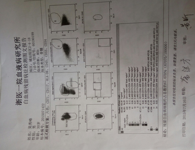 2015.8.16到北京大學國際醫(yī)院,因在浙江第一人民醫(yī)院做了兩次化療無法達到緩解(癌細胞殘留低于5/100)。