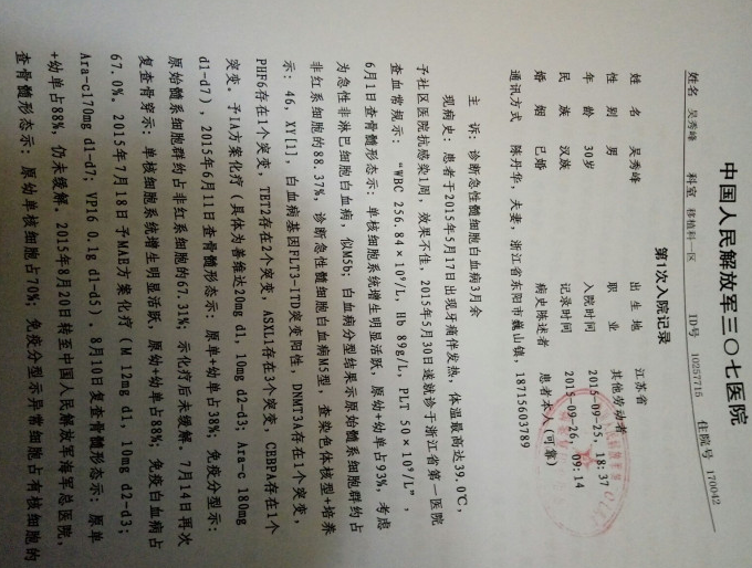 2015.9.25到北京解放軍307醫(yī)院,因在北京大學國際醫(yī)院做了一次化療還是沒有達到緩解!在307醫(yī)院做骨髓庫配型,化療,終于在第一次化療后得到緩解了。
