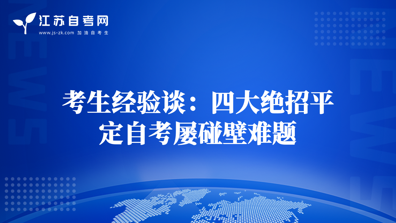 以上是關(guān)于考生經(jīng)驗(yàn)談:四大絕招平定自考屢碰壁難題已公布的相關(guān)信息,請(qǐng)自考生們認(rèn)真查看,如果你想獲取最新的江蘇自考新聞或者江蘇自考問(wèn)題答疑,可以掃描江蘇自考網(wǎng)公眾號(hào)二維碼,我們會(huì)最第一時(shí)間內(nèi)為你解答。