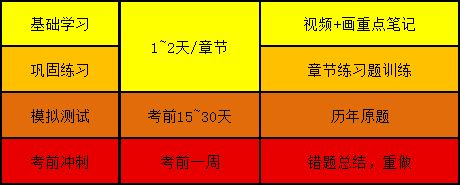 如果學(xué)習(xí)時間在一個小時以下,可以分作兩天為一單元(第一天學(xué)習(xí),第二天練習(xí)),兩小時左右可以一天之內(nèi)將一個章節(jié)的課程,練習(xí)全部完成,這樣效率也會高不少。兩個小時以上則是比較充裕,可以將前天試卷中的錯誤再寫一遍。一般來說一門課有十個章節(jié)左右,也就是說如果順利的話半個月可以學(xué)習(xí)完一門課程,兩個月可以學(xué)完四門課程,剩下的時間可以買一些歷年的原題來做一下,模擬考試環(huán)境,專心寫完之后隔天再做修改,將錯題統(tǒng)一記在本子上做考前復(fù)習(xí)。