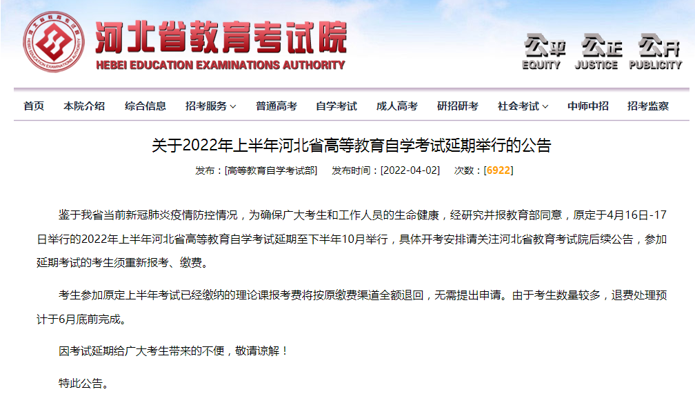 鑒于河北省當前新冠肺炎疫情防控情況,為確保廣大考生和工作人員的生命健康,經(jīng)研究并報教育部同意,原定于4月16日-17日舉行的2022年上半年河北省高等教育自學(xué)考試延期至下半年10月舉行,具體開考安排請關(guān)注河北省教育考試院后續(xù)公告,參加延期考試的考生須重新報考、繳費。