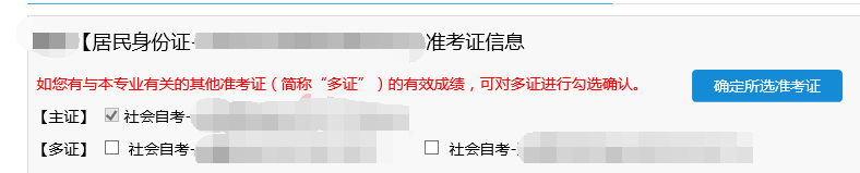 考生有本省多張準(zhǔn)考證且其中成績在本次畢業(yè)中需使用,則勾選相應(yīng)準(zhǔn)考證號,并點擊【確定所選準(zhǔn)考證】
