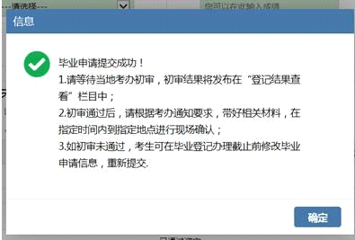 網(wǎng)上提交畢業(yè)申請后等待1-2天,再次進(jìn)入畢業(yè)申報(bào)系統(tǒng),在【現(xiàn)場確認(rèn)提醒】一欄查看審核意見,畢業(yè)初審?fù)ㄟ^的考生按考辦要求在規(guī)定時(shí)間內(nèi)到指定地點(diǎn)提交畢業(yè)材料。
