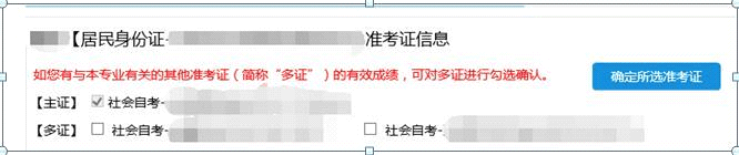 考生有本省多張準(zhǔn)考證且其中成績在本次畢業(yè)中需使用,則勾選相應(yīng)準(zhǔn)考證號,并點(diǎn)擊【確定所選準(zhǔn)考證】。(如勾選的多證沒有電子準(zhǔn)考證照片,按要求完成線上身份驗(yàn)證上后方可使用)。