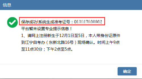 信息無(wú)誤后,系統(tǒng)會(huì)自動(dòng)生成一個(gè)準(zhǔn)考證號(hào)。新生去現(xiàn)場(chǎng)辦理準(zhǔn)考證時(shí),請(qǐng)牢記此號(hào)碼。
