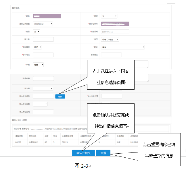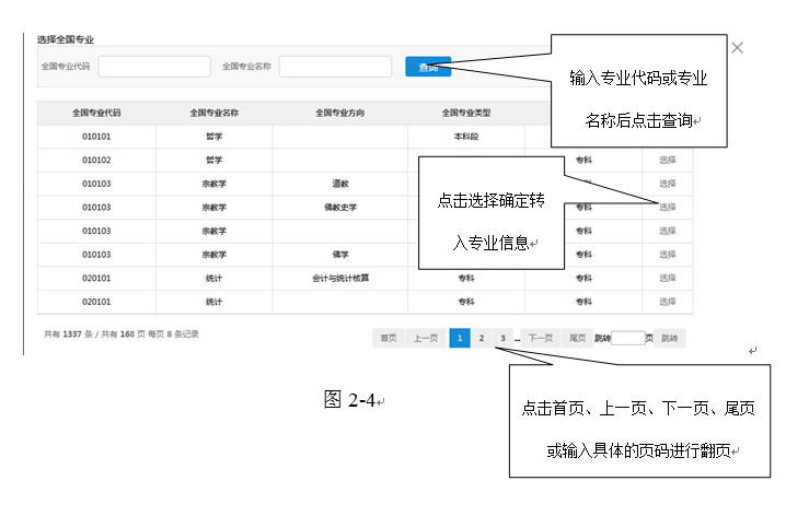 2、在轉(zhuǎn)出申請(qǐng)頁(yè)面(圖2-3),填寫(xiě)相關(guān)信息后,點(diǎn)擊確認(rèn)并提交完成轉(zhuǎn)出申請(qǐng)信息填寫(xiě),點(diǎn)擊重置可以清除已填寫(xiě)或選擇的信息。點(diǎn)擊選擇進(jìn)入全國(guó)專(zhuān)業(yè)信息選擇頁(yè)面(圖2-4),輸入全國(guó)專(zhuān)業(yè)代碼或者全國(guó)專(zhuān)業(yè)名稱(chēng),點(diǎn)擊查詢(xún)后系統(tǒng)以列表形式顯示符合條件的全國(guó)專(zhuān)業(yè)信息,點(diǎn)擊選擇確定轉(zhuǎn)出申請(qǐng)中的轉(zhuǎn)入專(zhuān)業(yè)信息,考生也可以通過(guò)翻頁(yè)功能逐頁(yè)查詢(xún)?nèi)珖?guó)專(zhuān)業(yè)信息。(頁(yè)面中標(biāo)注*的為必填項(xiàng),確認(rèn)并提交時(shí)會(huì)進(jìn)行校驗(yàn),如果填寫(xiě)的信息不符合要求,頁(yè)面上會(huì)顯示錯(cuò)誤提示信息,系統(tǒng)不允許確認(rèn)并提交)