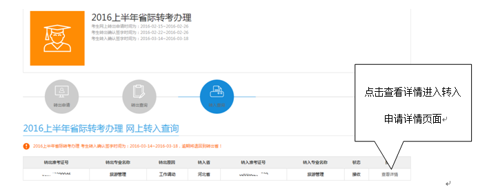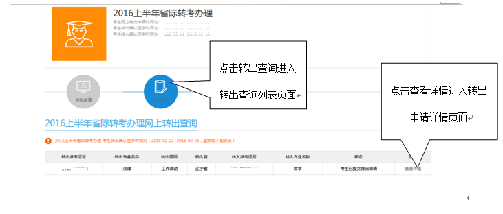考生登陸系統(tǒng)后,可以進(jìn)行轉(zhuǎn)出查詢(xún)(圖4-1)。點(diǎn)擊查看詳情可以查看轉(zhuǎn)出申請(qǐng)的詳細(xì)信息。