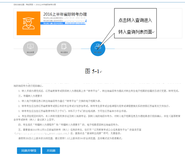 考生登陸系統(tǒng)后,點(diǎn)擊轉(zhuǎn)入查詢(xún)(圖5-1)進(jìn)入轉(zhuǎn)入須知頁(yè)面(圖5-2),考生點(diǎn)擊同意并繼續(xù),進(jìn)入轉(zhuǎn)入查詢(xún)列表頁(yè)面(圖5-3),點(diǎn)擊查看詳情可以查看轉(zhuǎn)入申請(qǐng)的詳細(xì)信息。轉(zhuǎn)入須知頁(yè)面點(diǎn)擊不同意返回到登陸頁(yè)面。
