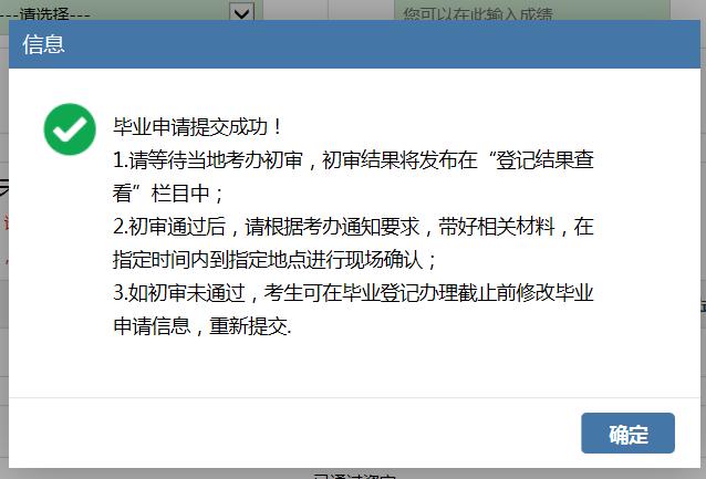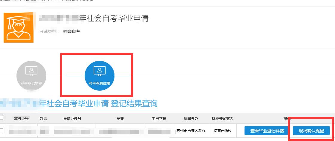網(wǎng)上提交申請后,考生須及時關注審核結果??忌稍凇翱忌榭唇Y果”功能中的【現(xiàn)場確認提醒】一欄查看審核意見,初審通過的考生按所轄區(qū)考辦要求在規(guī)定時間內到指定地點提交畢業(yè)材料。