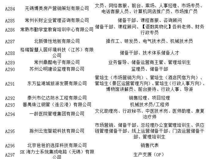 本次活動由江蘇省教育考試院與江蘇省高校招生就業(yè)指導(dǎo)服務(wù)中心聯(lián)合舉辦。目前已有揚(yáng)子江藥業(yè)、江蘇建設(shè)控股集團(tuán)、常州第四無線電廠、東方鹽湖城、SK海力士系統(tǒng)集成電路(無錫)有限公司等來自省內(nèi)外約150家企業(yè)報名參加。參會單位招聘需求如下(持續(xù)更新):