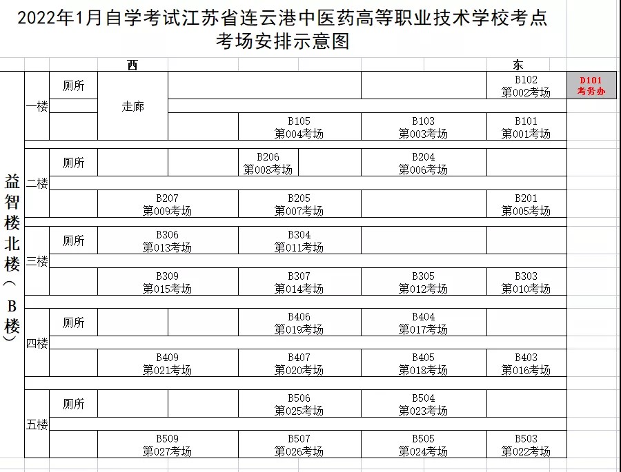 2022年1月高等教育自學(xué)考試將于1月8-9日舉行,本次考試共設(shè)立連云港中醫(yī)藥高等職業(yè)技術(shù)學(xué)校及江蘇省連云港中等專業(yè)學(xué)校兩個(gè)考點(diǎn),現(xiàn)將考點(diǎn)及考場(chǎng)分布圖公布如下:連云港中醫(yī)藥高等職業(yè)技術(shù)學(xué)校(北門入校):考場(chǎng)安排江蘇省
