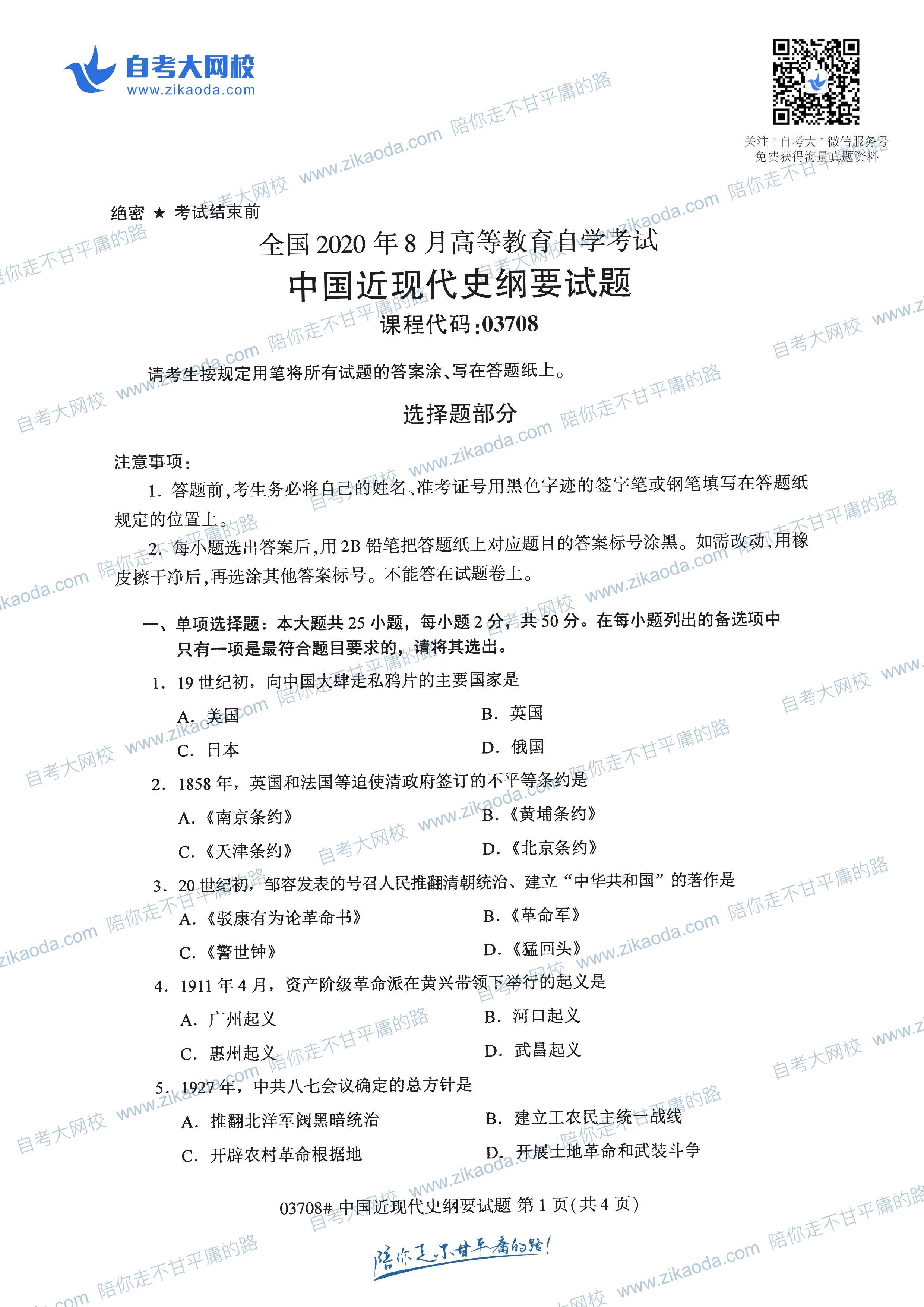 【問】老師您好,請問2020年8月自考本科近代史真題在哪下載?【答】同學你好,江蘇省2020年8月自考本科03708《中國近現(xiàn)代史綱要》真題免費下載請點擊以下鏈接。>>?全國2020年8月自考03708中國近現(xiàn)代史綱要真題試卷