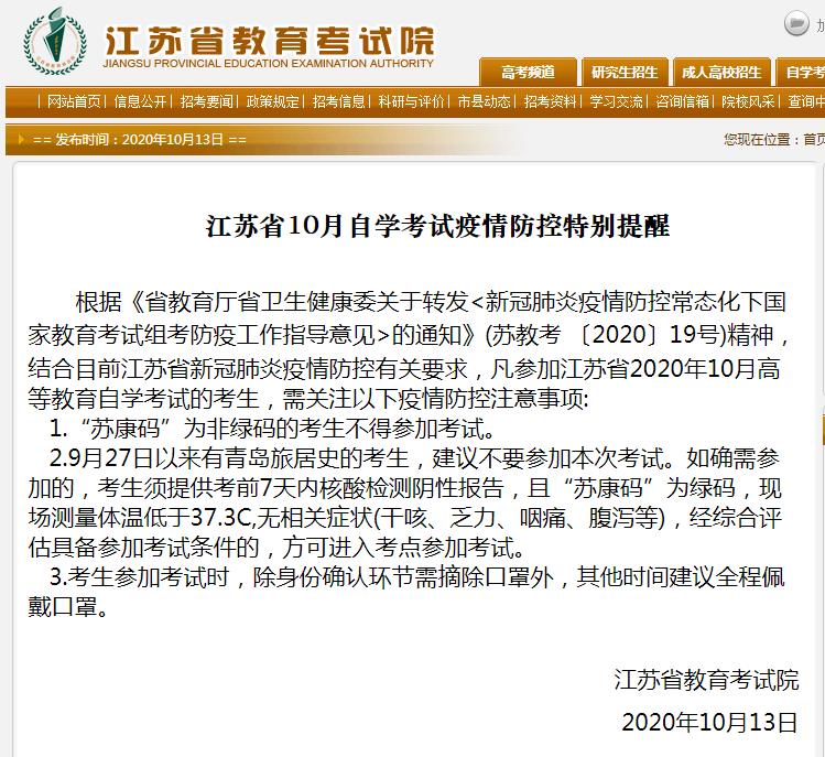 江蘇省10月自學(xué)考試疫情防控特別提醒