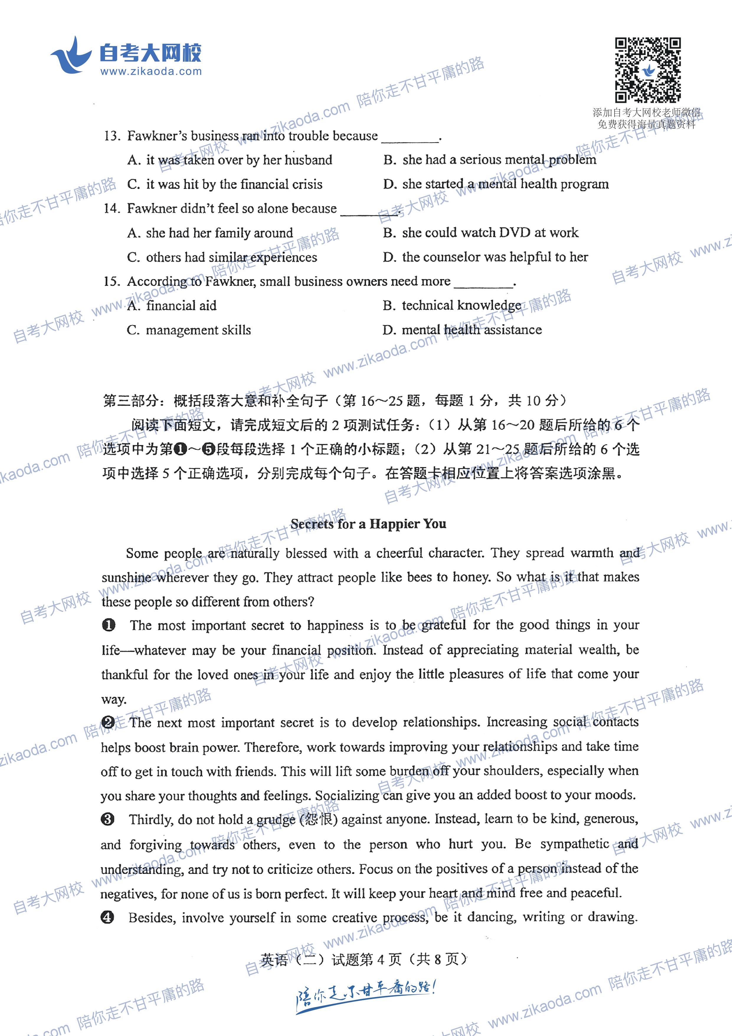 2022年4月自考00015英語二真題試卷及參考答案免費下載,真題是直接、一手的復(fù)習(xí)資料,它反映考試的真實難度、命題方向等,請務(wù)必重視對真題的訓(xùn)練!