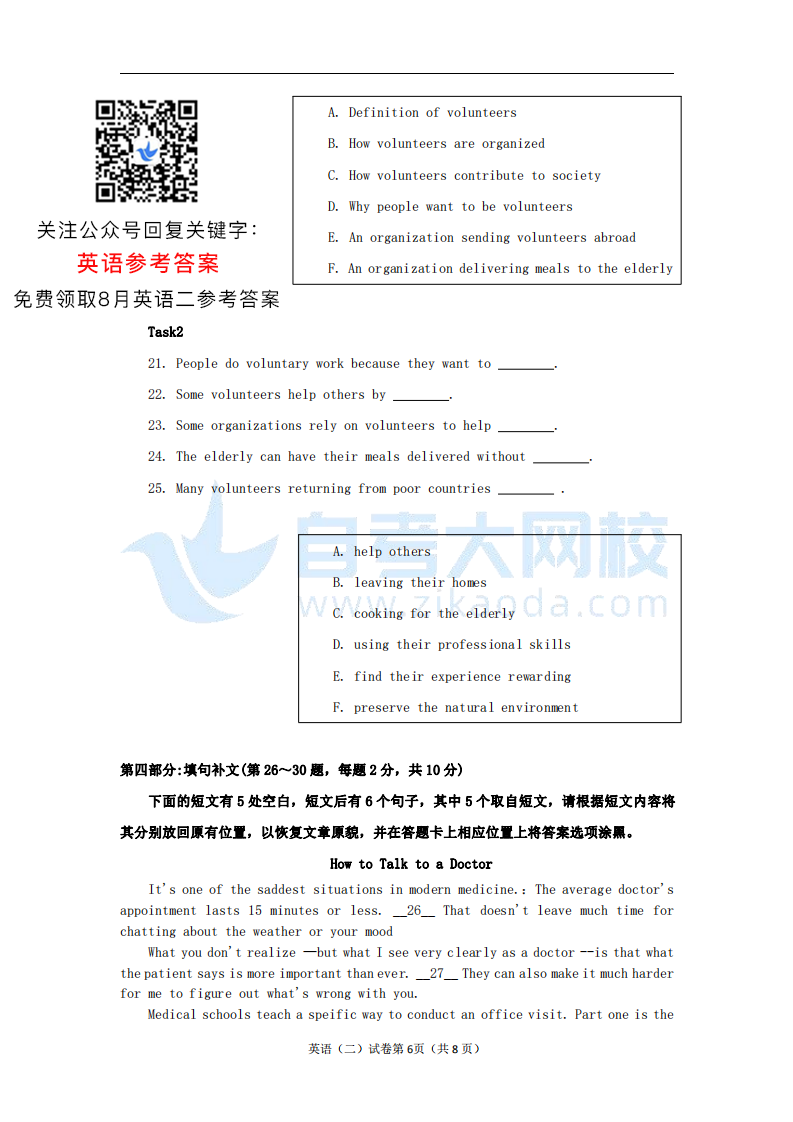 2021年4月自考00015英語二真題卷下載:第四題填句補(bǔ)文。4月自考英語二真題卷,第四部分:填句補(bǔ)文(第26~30題,每題2分,共10分)下面的短文有5處空白,短文后有6個句子,其中5個取自短文,請根據(jù)短文內(nèi)容將其分別放回原有位置