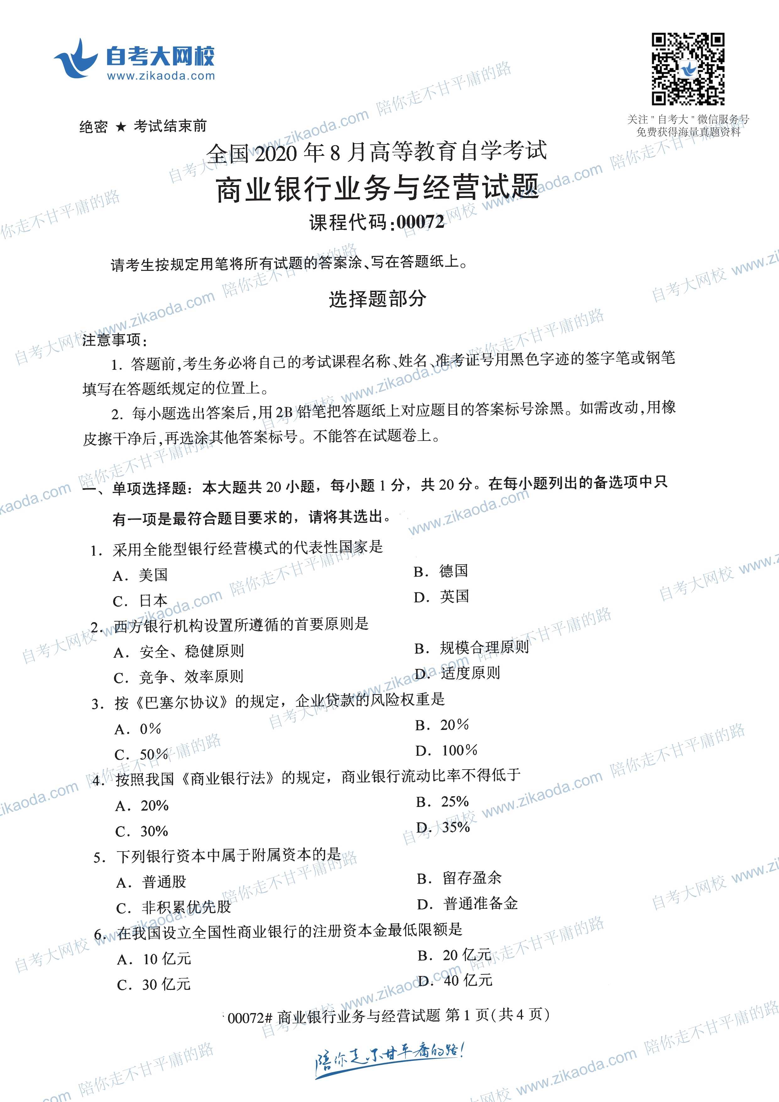 全國(guó)2020年8月自考00072商業(yè)銀行業(yè)務(wù)與經(jīng)營(yíng)真題試卷下載