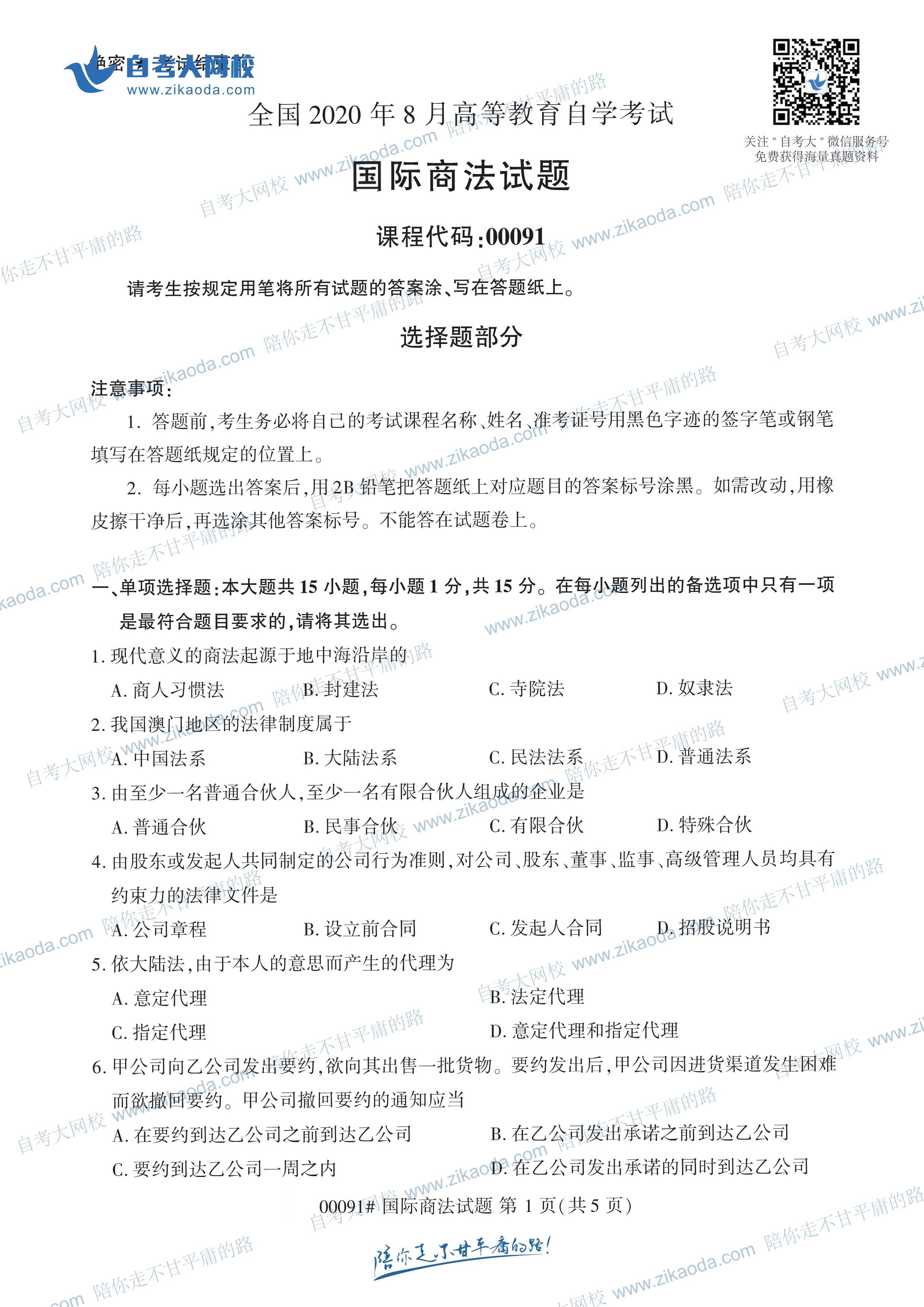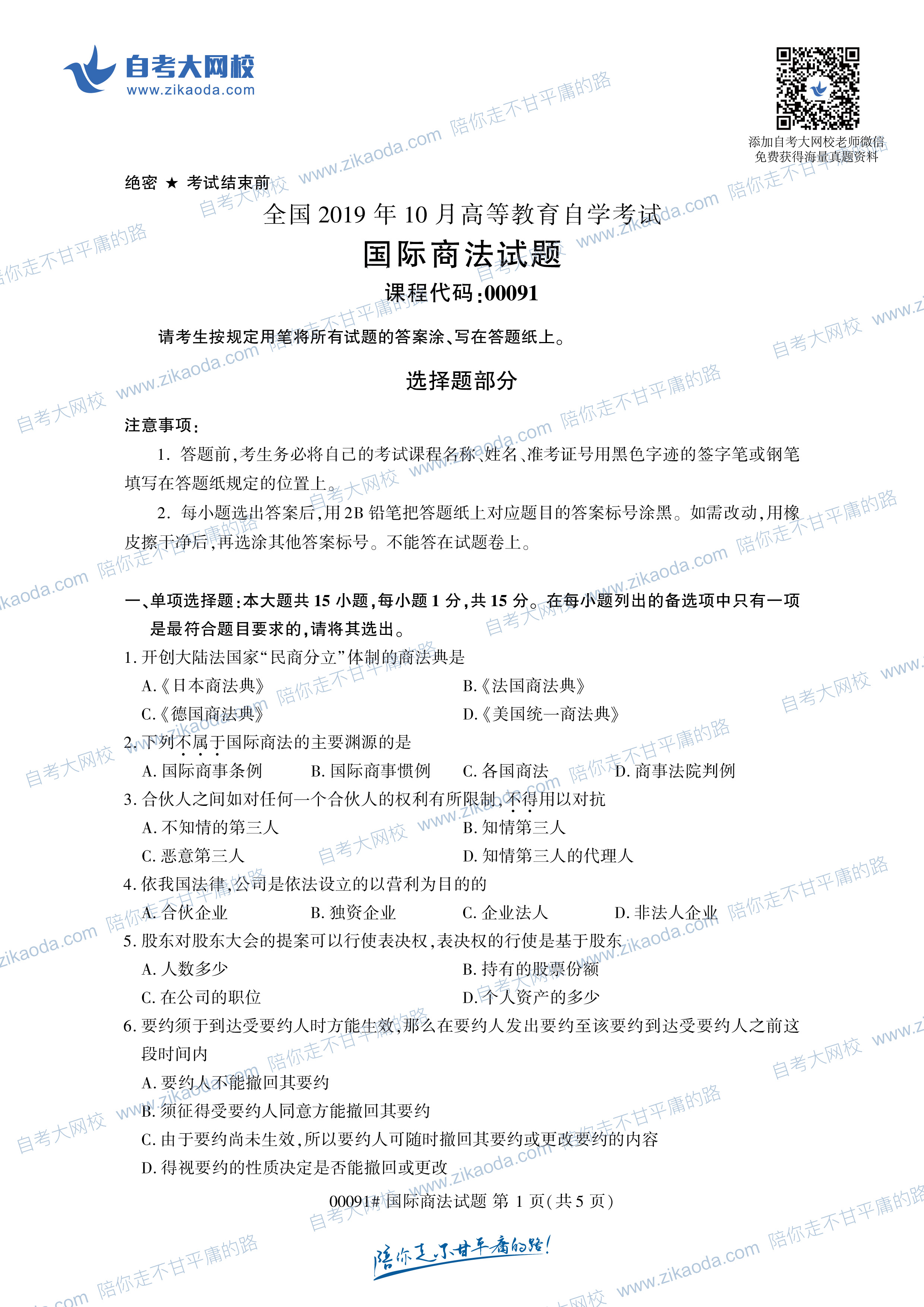 絕密 ★ 考試結(jié)束前 全國2014年4月高等教育自學(xué)考試 國際商法試題 課程代碼:00091 請考生按規(guī)定用筆將所有試題的答案涂、寫在答題紙上。 選擇題部分 注意事項: 1. 答題前,考生務(wù)必將自己的考試課程名稱、姓名、準考證號用黑色字跡的簽字筆或鋼筆填寫在答題紙規(guī)定的位置上。 2. 每小題選出答案后,用2B鉛筆把答題紙上對應(yīng)題目的答案標號涂黑。如需改動,用橡皮擦干凈后,再選涂其他答案標號。不能答在試題卷上。 一、單項選擇題(本大題