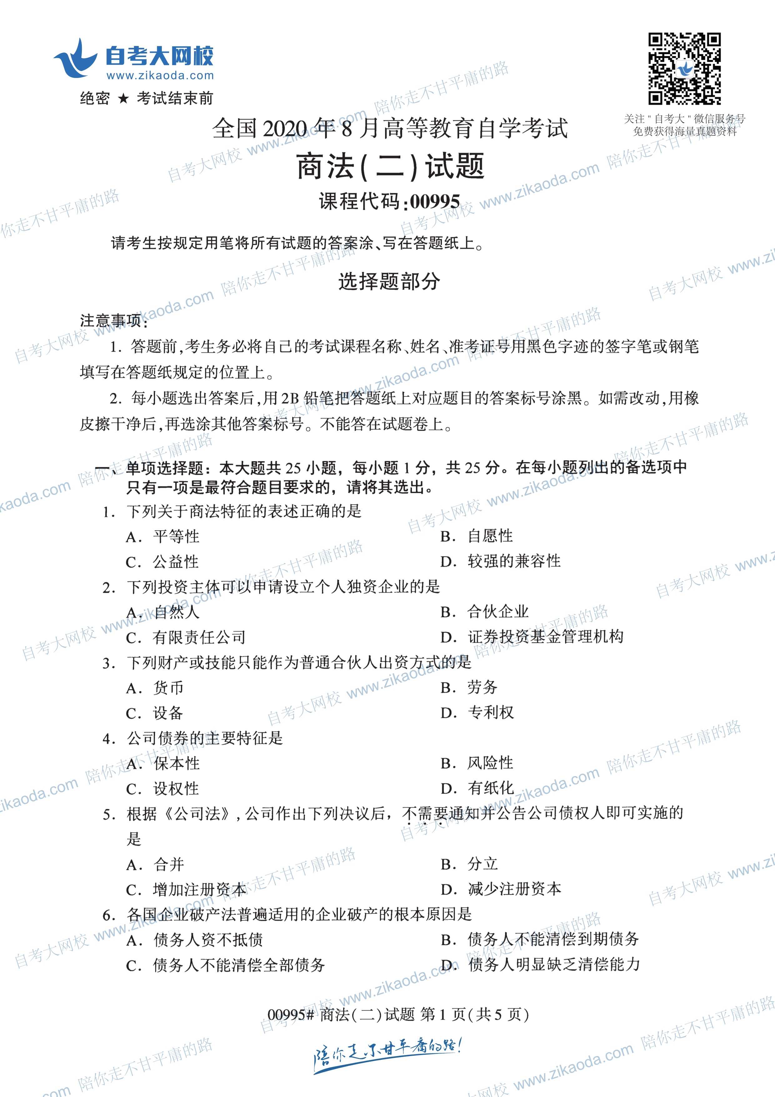 絕密★考試結(jié)束前 全國2014年4月高等教育自學(xué)考試 商法(二)試題 課程代碼:00995 請考生按規(guī)定用筆將所有試題的答案涂、寫在答題紙上。 選擇題部分 注意事項: 1.答題前,考生務(wù)必將自己的考試課程名稱、姓名、準考證號用黑色字跡的簽字筆或鋼筆填寫在答題紙規(guī)定的位置上。 2.每小題選出答案后,用2B鉛筆把答題紙上對應(yīng)題目的答案標號涂黑。如需改動,用橡皮擦干凈后,再選涂其他答案標號。不能答在試題卷上。 一、單項選擇題(本大題共25小題,每小題1分,共25分) 在每