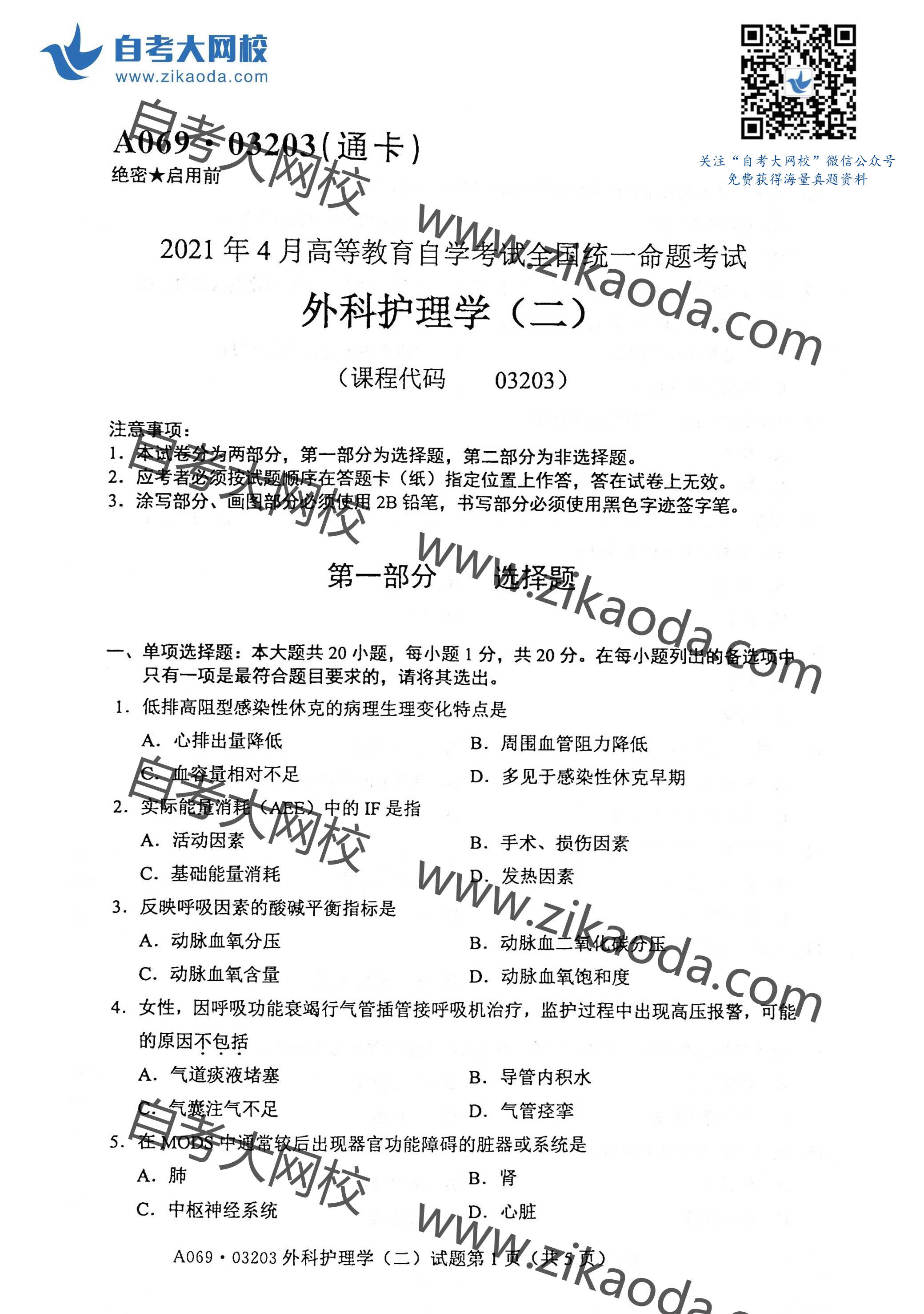 全國2021年4月自考03203外科護(hù)理學(xué)(二)真題試卷完整版試卷請聯(lián)系微信客服免費(fèi)索取備注:4月自考試卷微信客服二維碼