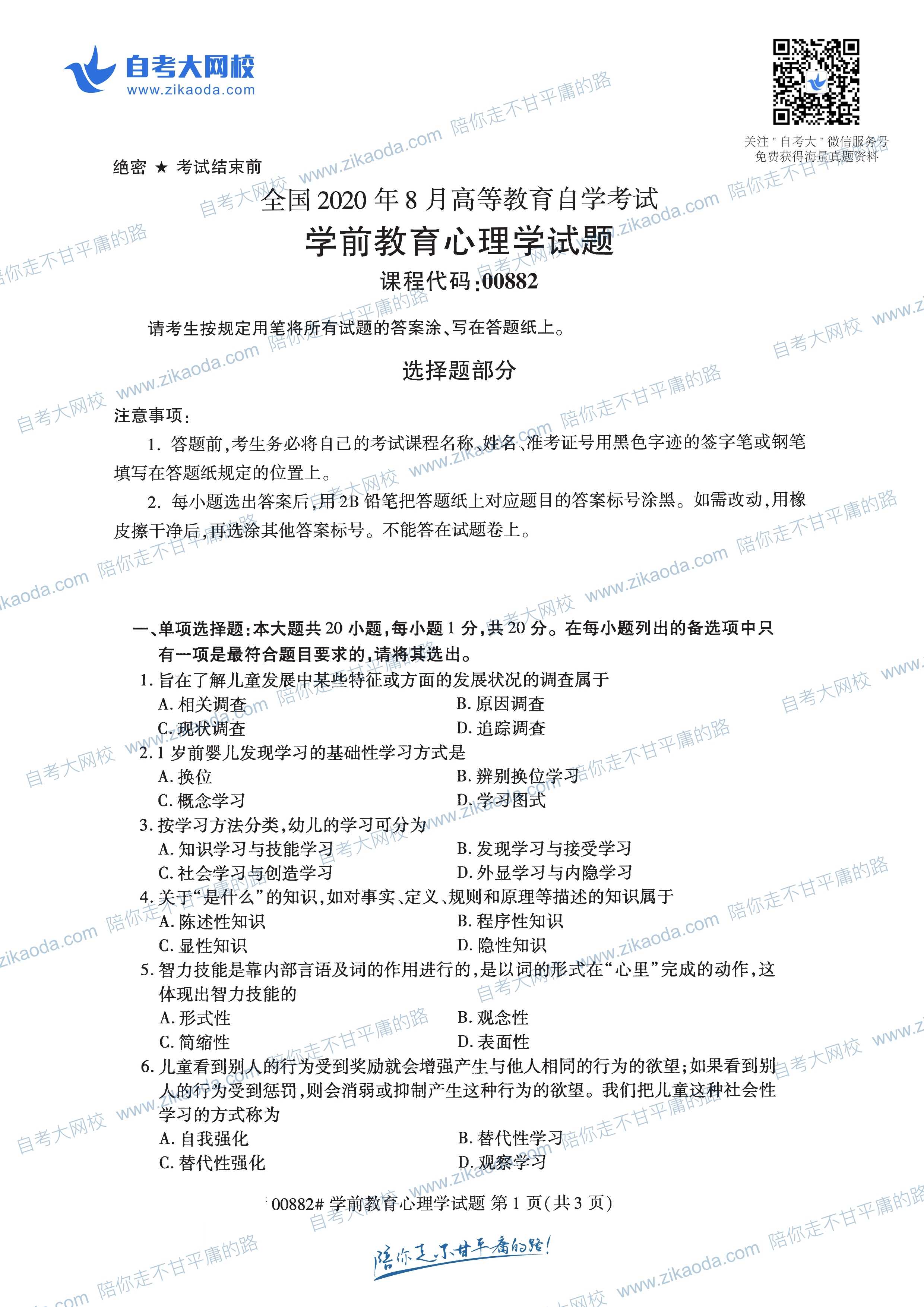 2022年10月全國自考00882學(xué)前教育心理學(xué)真題試卷已經(jīng)可以免費(fèi)下載,該試卷由江蘇自考網(wǎng)整理