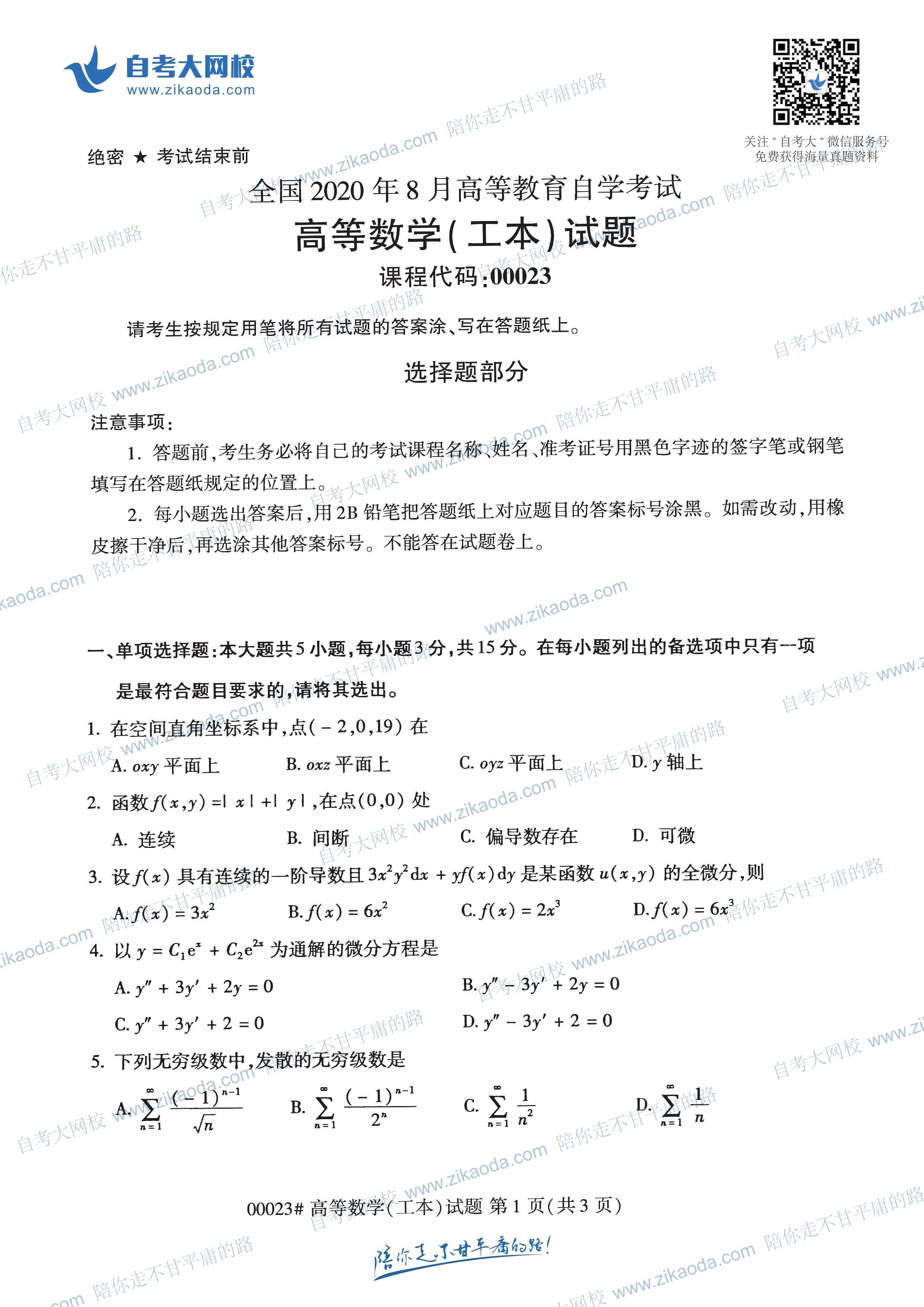2022年10月全國(guó)自考00023高等數(shù)學(xué)(工本)真題試卷已經(jīng)可以免費(fèi)下載,該試卷由江蘇自考網(wǎng)整理