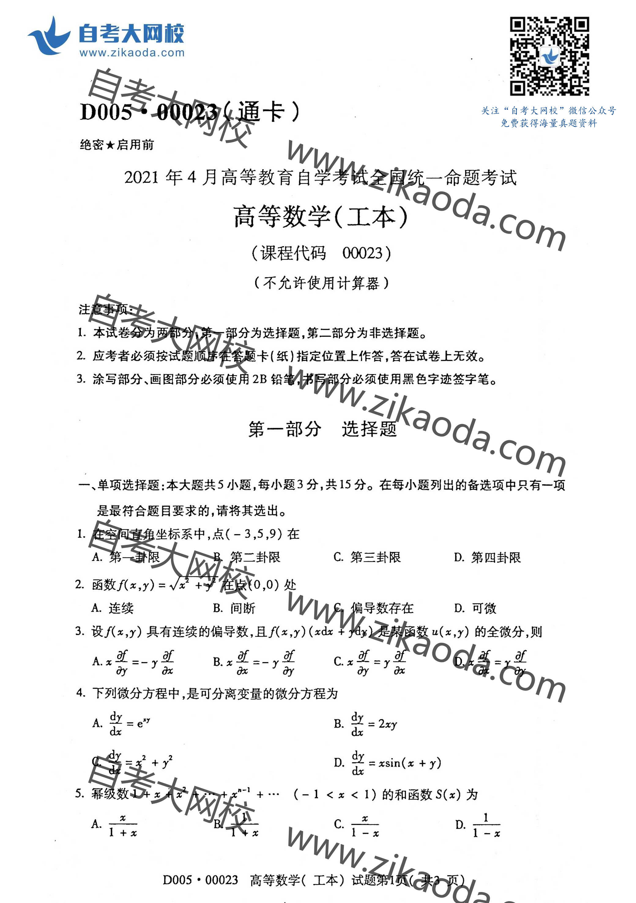 全國(guó)2021年4月自考00023高等數(shù)學(xué)(工本)真題試卷完整版試卷請(qǐng)聯(lián)系微信客服免費(fèi)索取備注:4月自考試卷微信客服二維碼