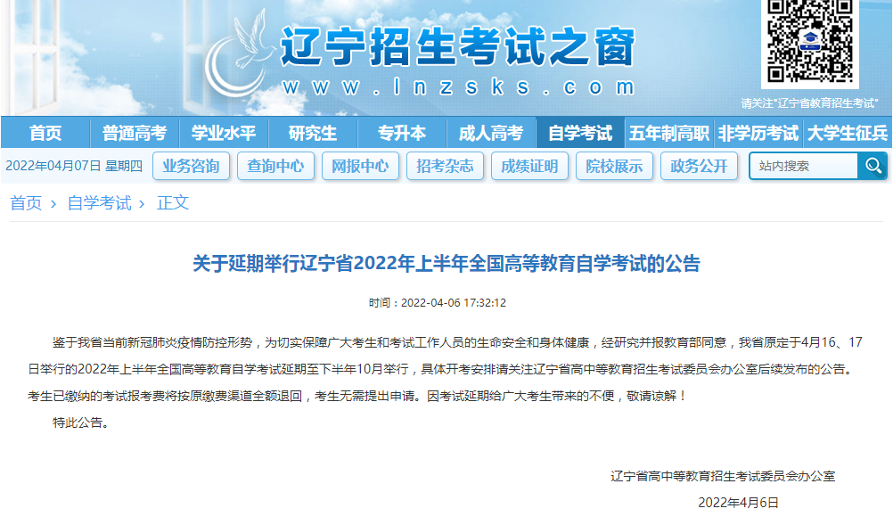 關(guān)于延期舉行遼寧省2022年上半年全國高等教育自學(xué)考試的公告