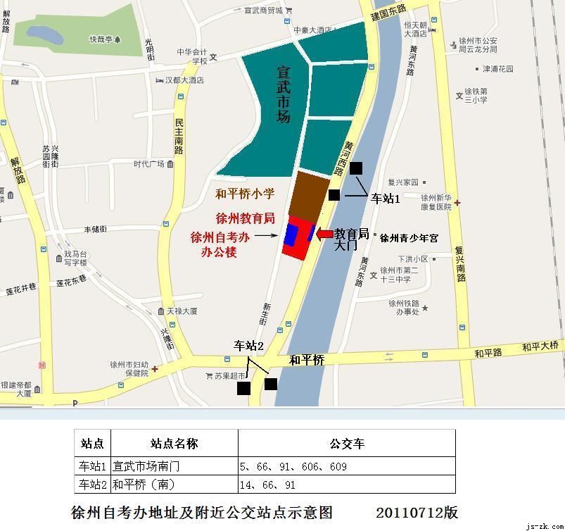 徐州自考辦:徐州市新生街76號(宣武市場南門(站臺)向南200米左右) 電話:0516-83737568 ? 沿黃河西路走最好,在路的西邊,地點外貌如下圖所示。 自考辦界于建國東路與和平路中間。 ? 公交路線: 1、宣武