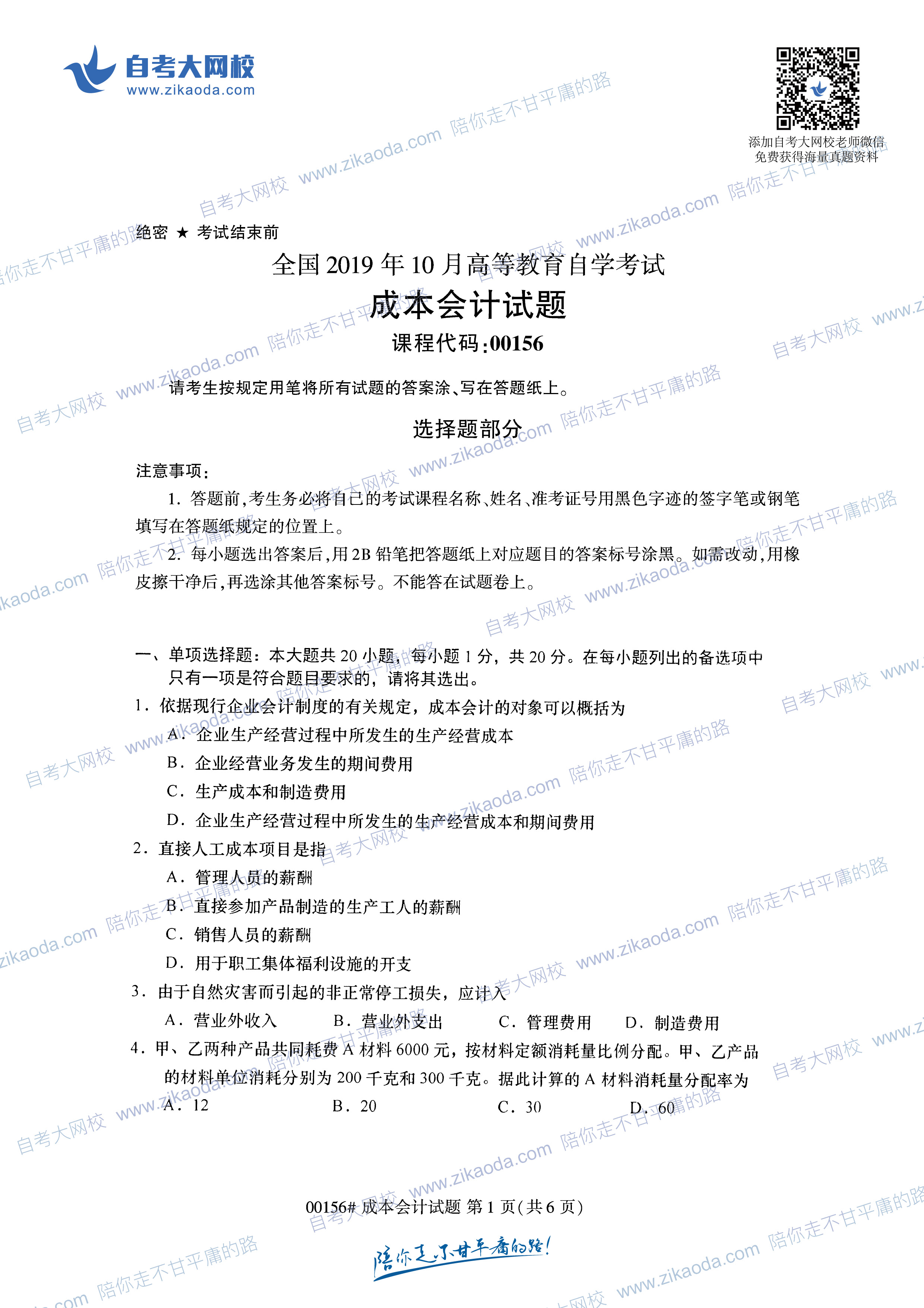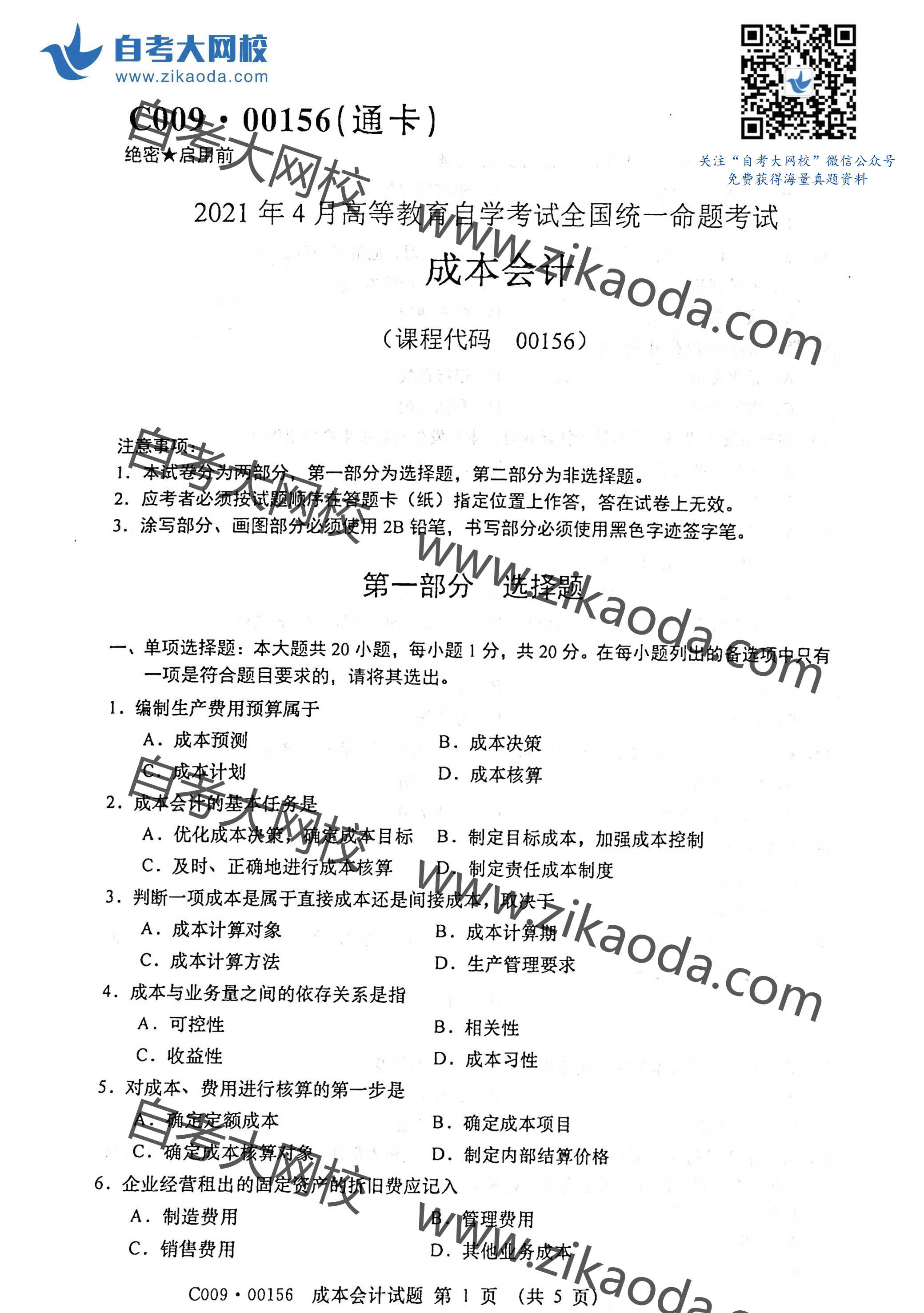 絕密★考試結束前 全國2014年4月高等教育自學考試 成本會計試題 課程代碼:00156 請考生按規(guī)定用筆將所有試題的答案涂、寫在答題紙上。 選擇題部分 注意事項: 1.答題前,考生務必將自己的姓名、準考證號用黑色字跡的簽字筆或鋼筆填寫在答題紙規(guī)定的位置上。 2.每小題選出答案后,用2B鉛筆把答題紙上對應題目的答案標號涂黑。如需改動,用橡皮擦干凈后,再選涂其他答案標號。不能答在試題卷上。 一、單項選擇題(本大題共20小題,每小題1分,共20分) 在每小題列出的四個備選項中只有一