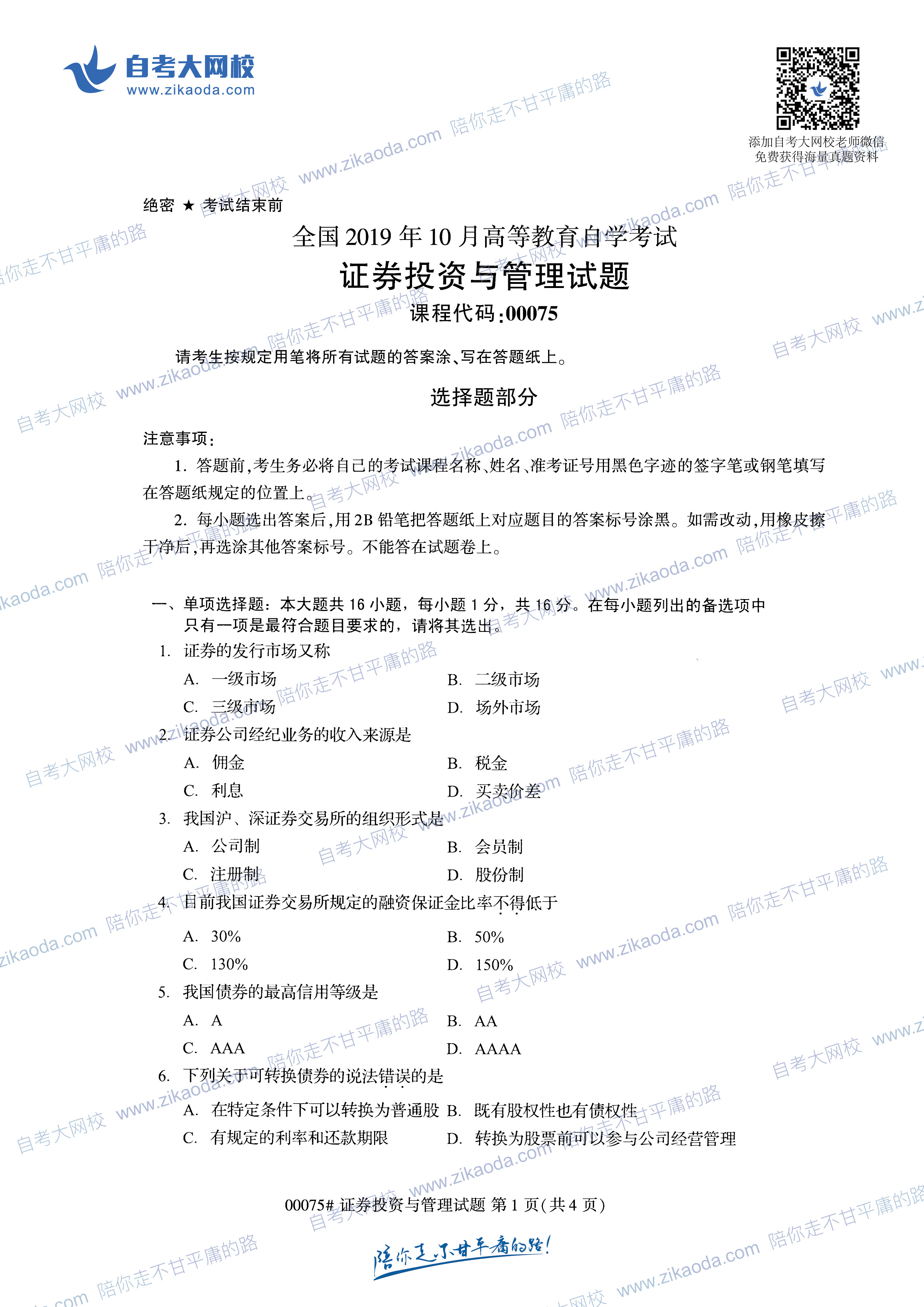 絕密★考試結(jié)束前 全國2014年4月高等教育自學考試 證券投資與管理試題 課程代碼:00075 請考生按規(guī)定用筆將所有試題的答案涂、寫在答題紙上。 選擇題部分 注意事項: 1.答題前,考生務必將自己的考試課程名稱、姓名、準考證號用黑色字跡的簽字筆或鋼筆填寫在答題紙規(guī)定的位置上。 2.每小題選出答案后,用2B鉛筆把答題紙上對應題目的答案標號涂黑。如需改動,用橡皮擦干凈后,再選涂其他答案標號。不能答在試題卷上。 一、單項選擇題(本大題共20小題,每小題1分,共