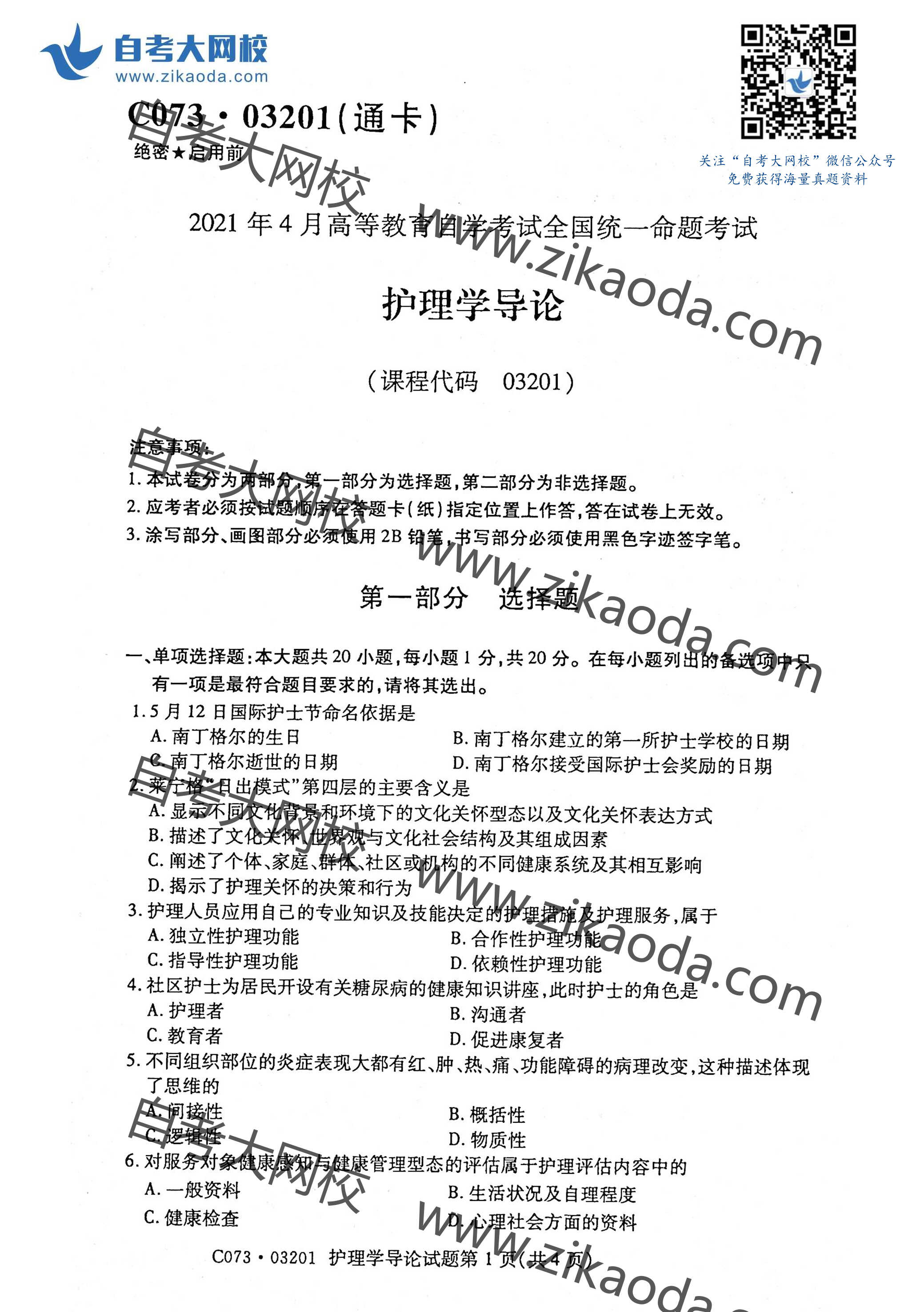 全國2021年4月自考03201護理學(xué)導(dǎo)論真題試卷完整版試卷請聯(lián)系微信客服免費索取備注:4月自考試卷微信客服二維碼