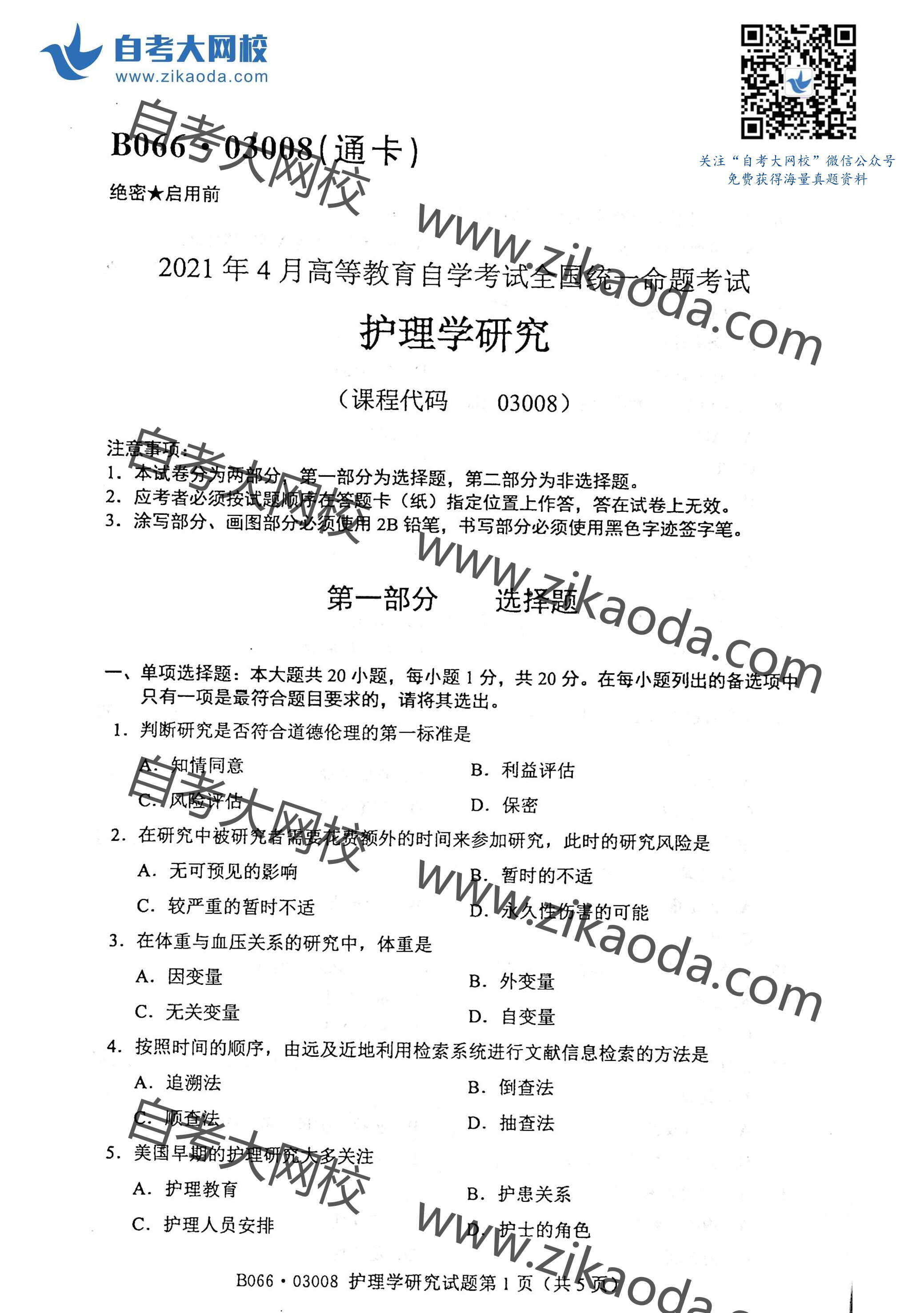 全國2021年4月自考03008護(hù)理學(xué)研究真題試卷完整版試卷請聯(lián)系微信客服免費(fèi)索取備注:4月自考試卷微信客服二維碼