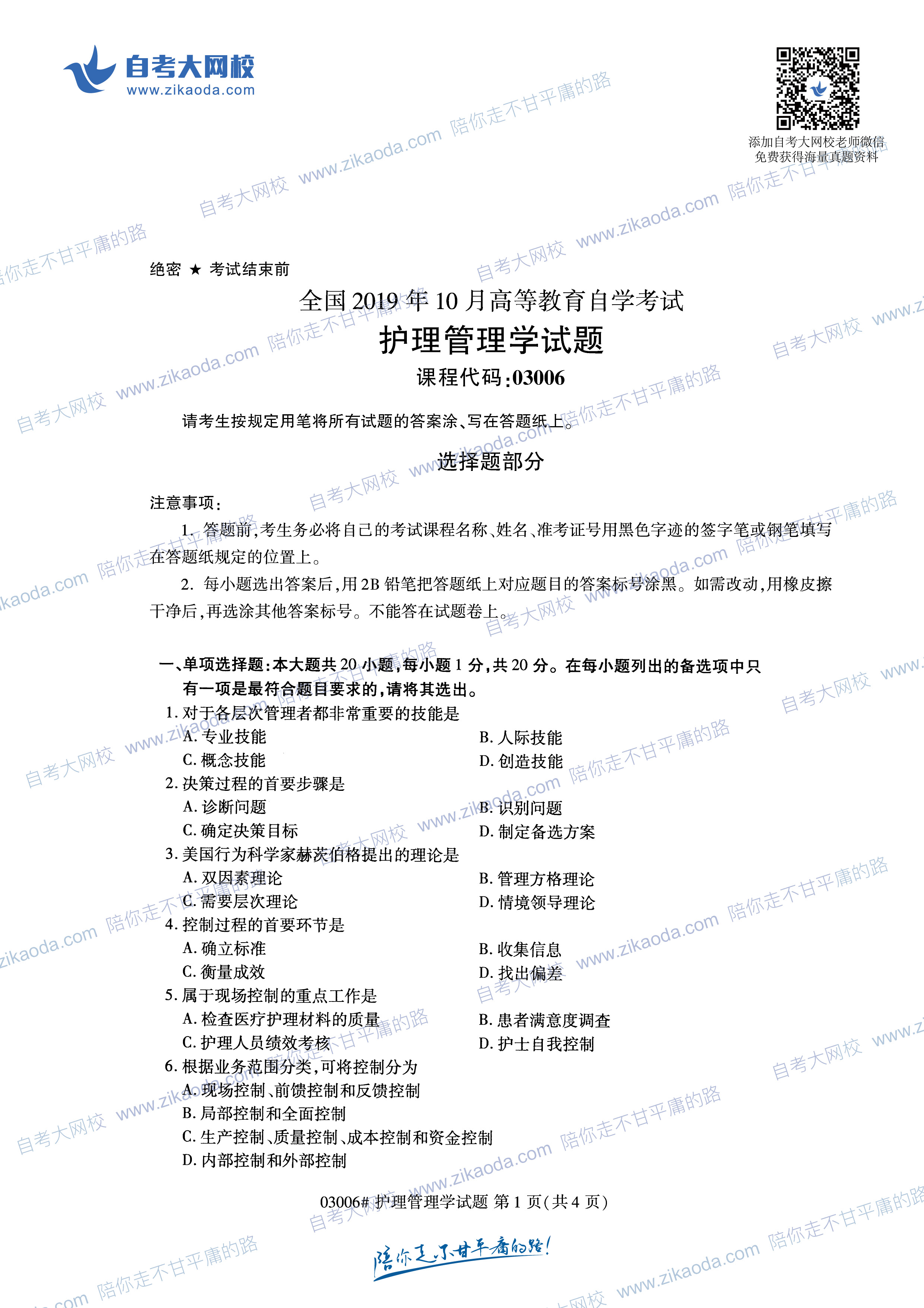 全國(guó)2019年10月自考03006護(hù)理管理學(xué)真題試卷免費(fèi)下載!