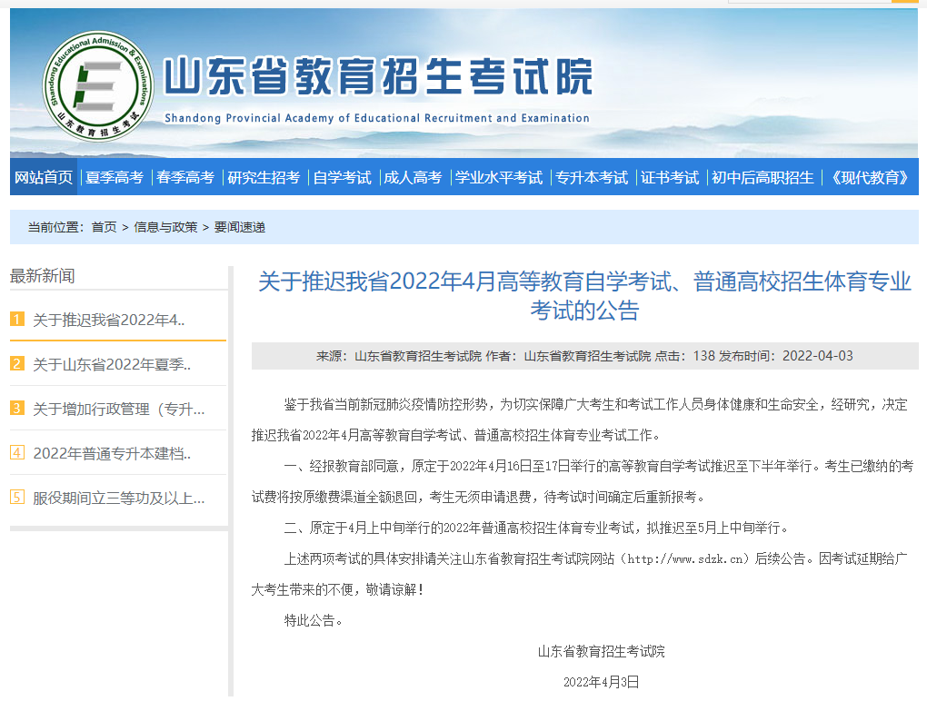 鑒于山東省當(dāng)前新冠肺炎疫情防控形勢(shì),為切實(shí)保障廣大考生和考試工作人員身體健康和生命安全,經(jīng)研究,決定推遲我省2022年4月高等教育自學(xué)考試、普通高校招生體育專業(yè)考試工作。一、經(jīng)報(bào)教育部同意,原定于2022年4月16日