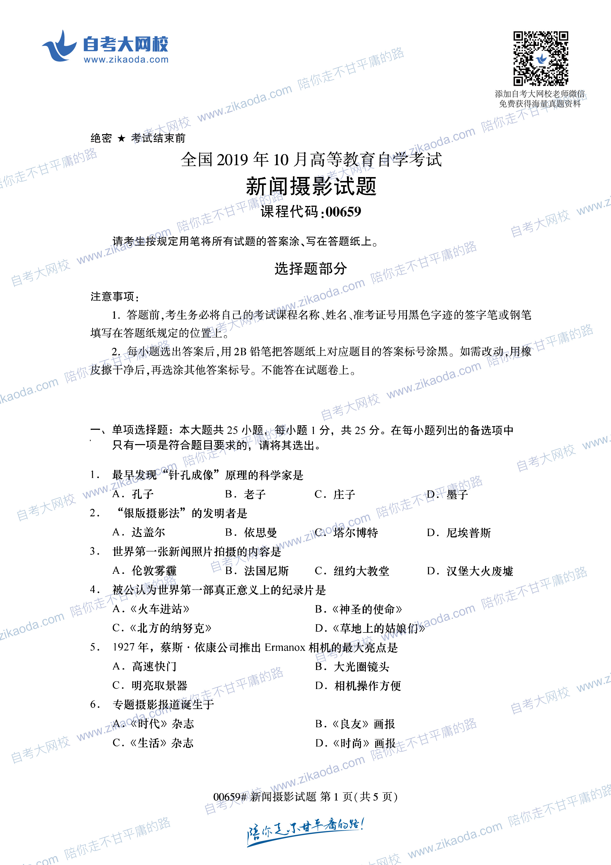 絕密 ★ 考試結(jié)束前 全國2014年4月高等教育自學(xué)考試 新聞攝影試題 課程代碼:00659 請考生按規(guī)定用筆將所有試題的答案涂、寫在答題紙上。 選擇題部分 注意事項: 1. 答題前,考生務(wù)必將自己的考試課程名稱、姓名、準(zhǔn)考證號用黑色字跡的簽字筆或鋼筆填寫在答題紙規(guī)定的位置上。 2. 每小題選出答案后,用2B鉛筆把答題紙上對應(yīng)題目的答案標(biāo)號涂黑。如需改動,用橡皮擦干凈后,再選涂其他答案標(biāo)號。不能答在試題卷上。 一、項選擇題(本大題共25小題