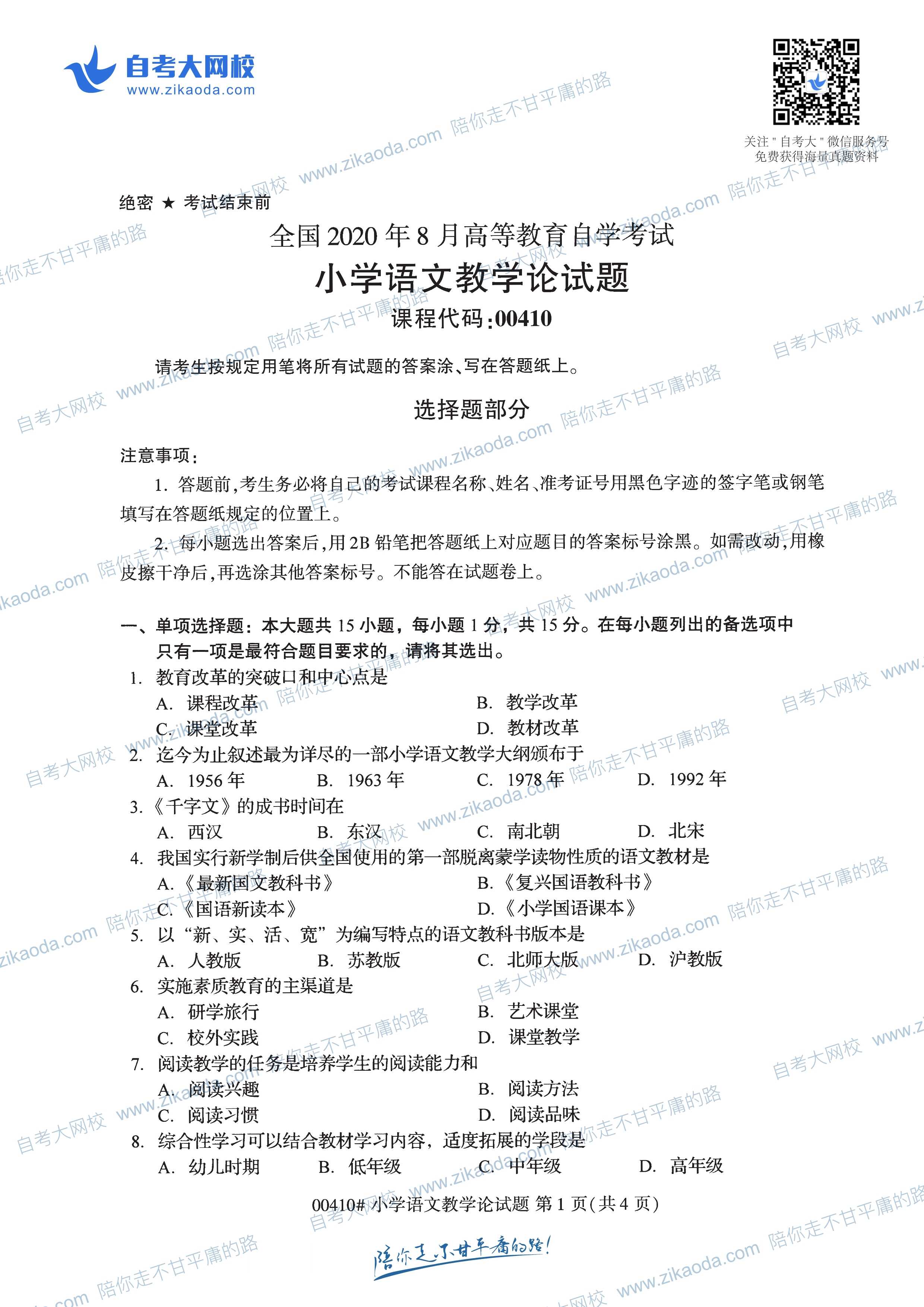 2022年10月全國自考00410小學(xué)語文教學(xué)論真題試卷已經(jīng)可以免費下載,該試卷由江蘇自考網(wǎng)整理