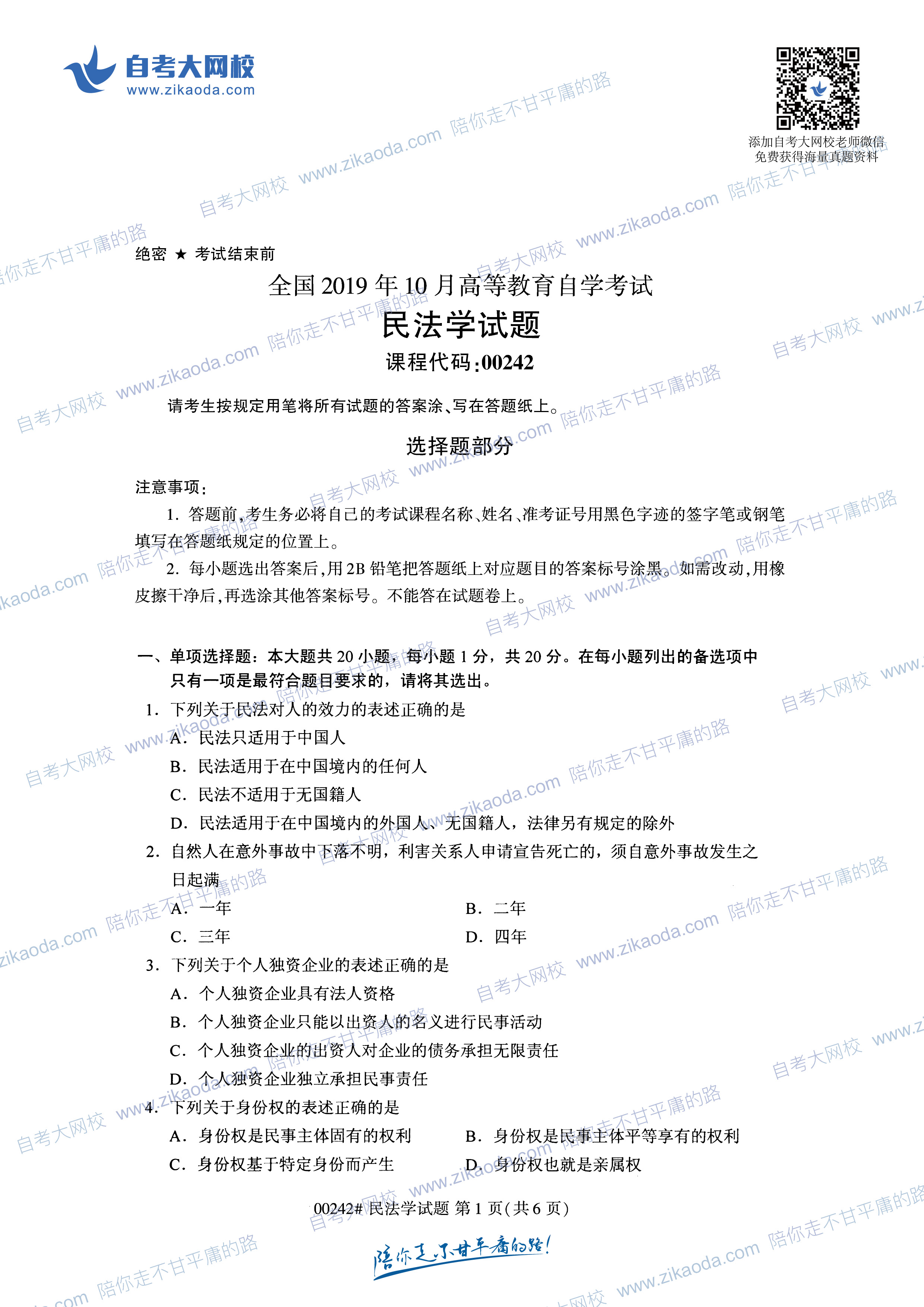 絕密★考試結(jié)束前 全國2013年10月高等教育自學(xué)考試 民法學(xué)試題 課程代碼:00242 請考生按規(guī)定用筆將所有試題的答案涂、寫在答題紙上。 選擇題部分 注意事項: 1.答題前,考生務(wù)必將自己的考試課程名稱、姓名、準考證號用黑色字跡的簽字筆或鋼筆填寫在答題紙規(guī)定的位置上。 2.每小題選出答案后,用2B鉛筆把答題紙上對應(yīng)題目的答案標(biāo)號涂黑。如需改動,用橡皮擦干凈后,再選涂其他答案標(biāo)號。不能答在試題卷上。 一、單項選擇題(本大題共20小題,每小題1分,