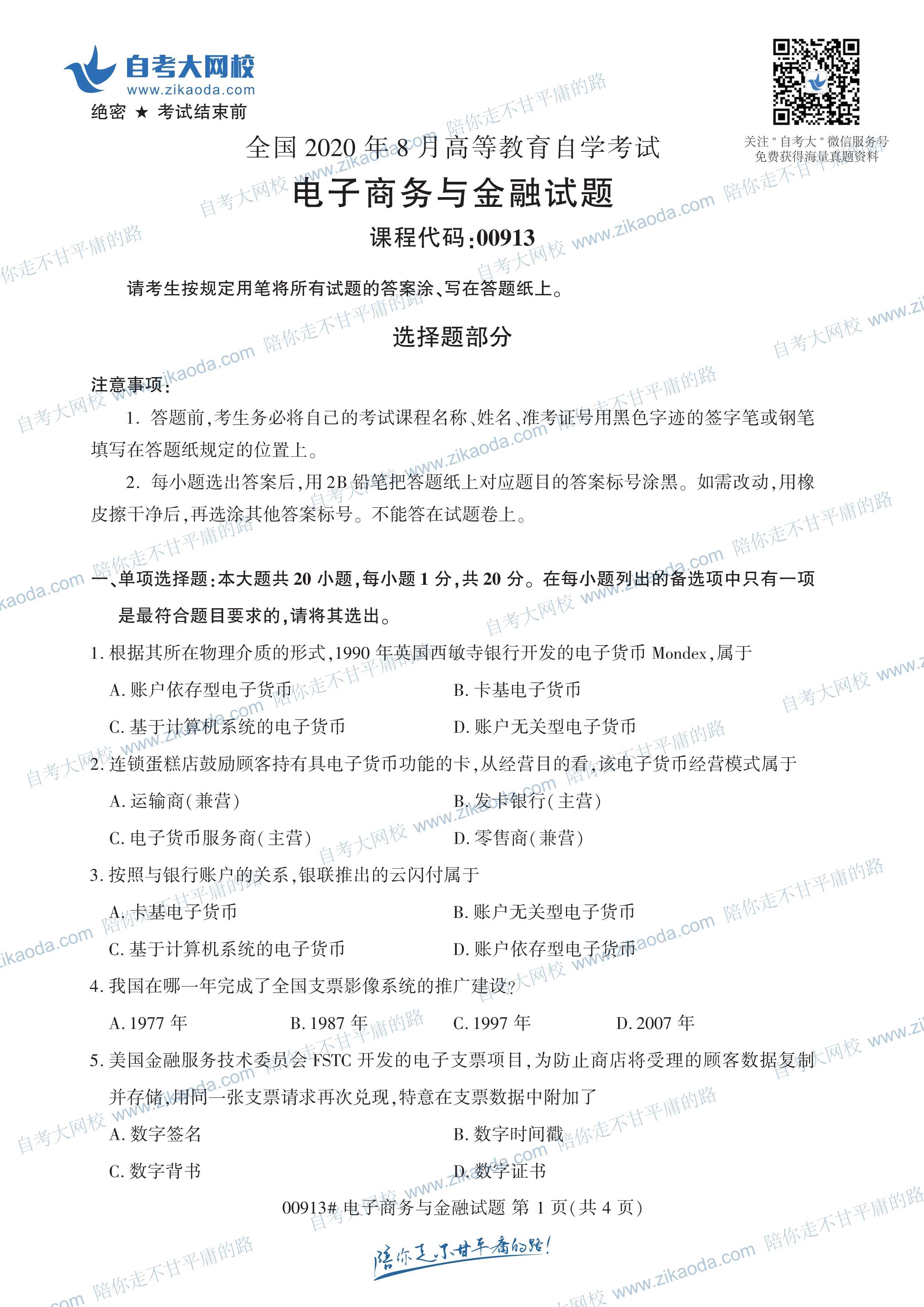 全國2021年4月自考00913電子商務(wù)與金融真題試卷、完整版試卷請掃碼關(guān)注免費索取關(guān)鍵詞回復(fù):對應(yīng)科目代碼解壓密碼:zikaoda