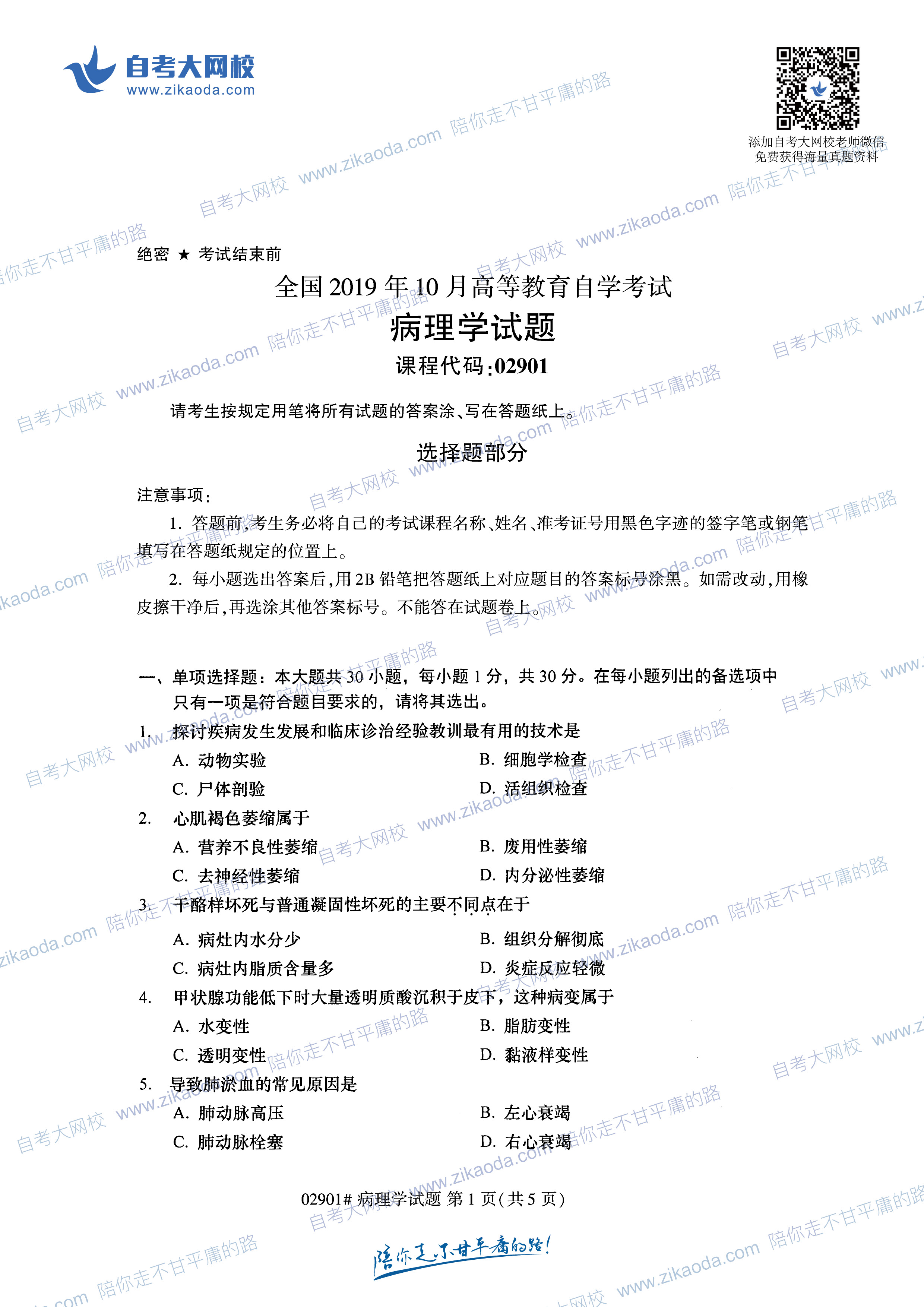 絕密★考試結(jié)束前 全國2014年4月高等教育自學考試 病理學試題 課程代碼:02901 請考生按規(guī)定用筆將所有試題的答案涂、寫在答題紙上。 選擇題部分注意事項: 1.答題前,考生務必將自己的考試課程名稱、姓名、準考證號用黑色字跡的簽字筆或鋼筆填寫在答題紙規(guī)定的位置上。 2.每小題選出答案后,用2B鉛筆把答題紙上對應題目的答案標號涂黑。如需改動,用橡皮擦干凈后,再選涂其他答案標號。不能答在試