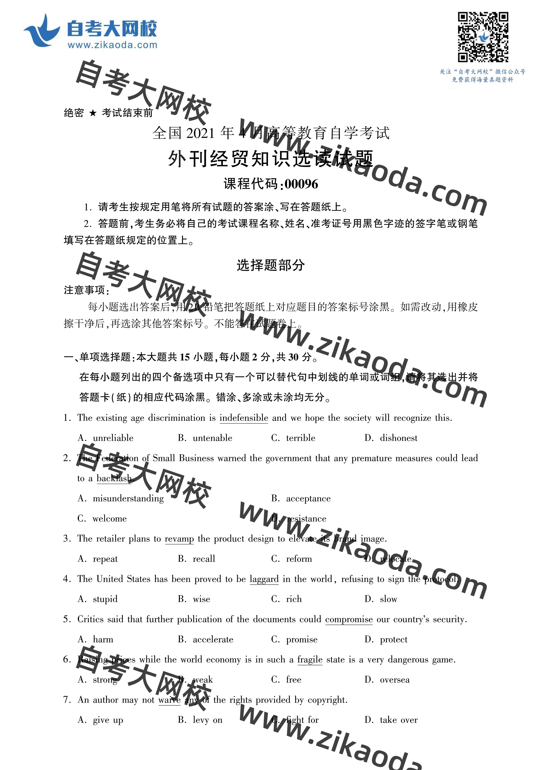 全國2021年4月自考00096外刊經(jīng)貿(mào)知識(shí)選讀真題試卷完整版試卷請(qǐng)掃碼關(guān)注免費(fèi)索取關(guān)鍵詞回復(fù):對(duì)應(yīng)科目代碼解壓密碼:zikaoda完整版試卷請(qǐng)掃碼關(guān)注免費(fèi)索取關(guān)鍵詞回復(fù):對(duì)應(yīng)科目代碼解壓密碼:zikaoda