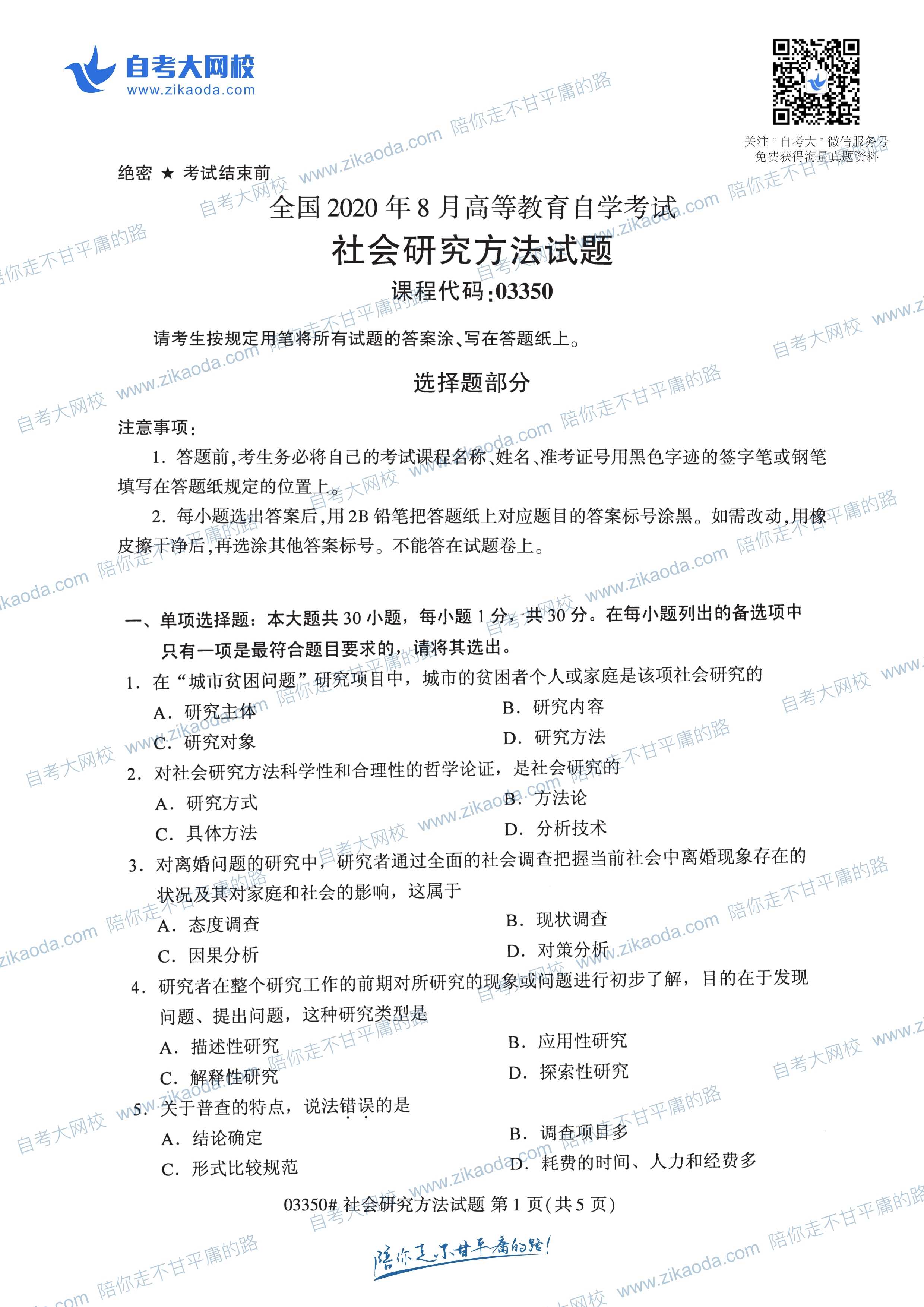 絕密★考試結(jié)束前 全國2014年4月高等教育自學(xué)考試 社會研究方法試題 課程代碼:03350 請考生按規(guī)定用筆將所有試題的答案涂、寫在答題紙上。 選擇題部分 注意事項: 1.答題前,考生務(wù)必將自己的考試課程名稱、姓名、準(zhǔn)考證號用黑色字跡的簽字筆或鋼筆填寫在答題紙規(guī)定的位置上。 2.每小題選出答案后,用2B鉛筆把答題紙上對應(yīng)題目的答案標(biāo)號涂黑。如需改動,用橡皮擦干凈后,再選涂其他答案標(biāo)號。不能答在試題卷上。 一、單項選擇題(本大題共30小題,每小題1分,共30分) 在每小