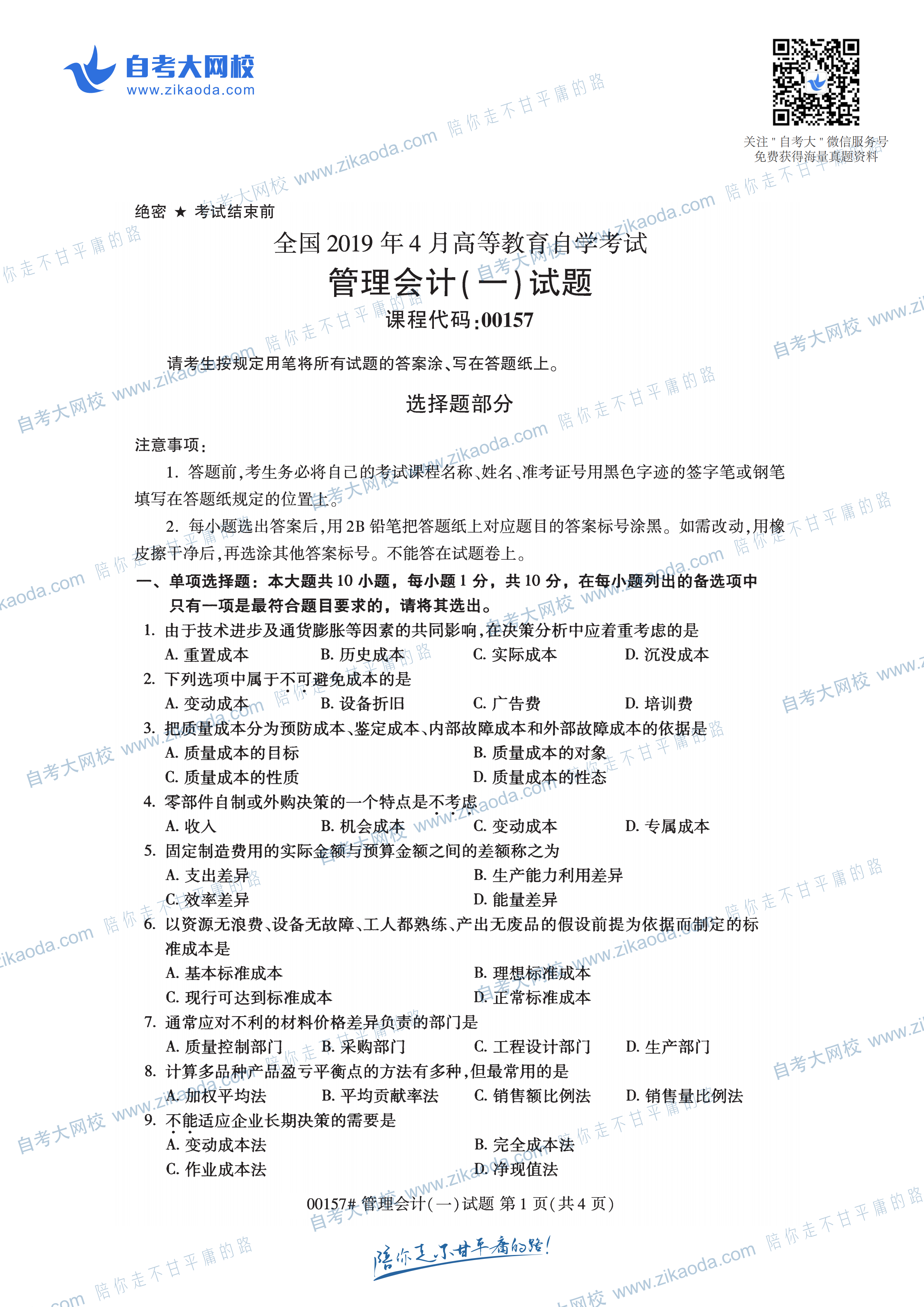 全國(guó)2019年4月自考00157管理會(huì)計(jì)(一)真題試卷免費(fèi)下載