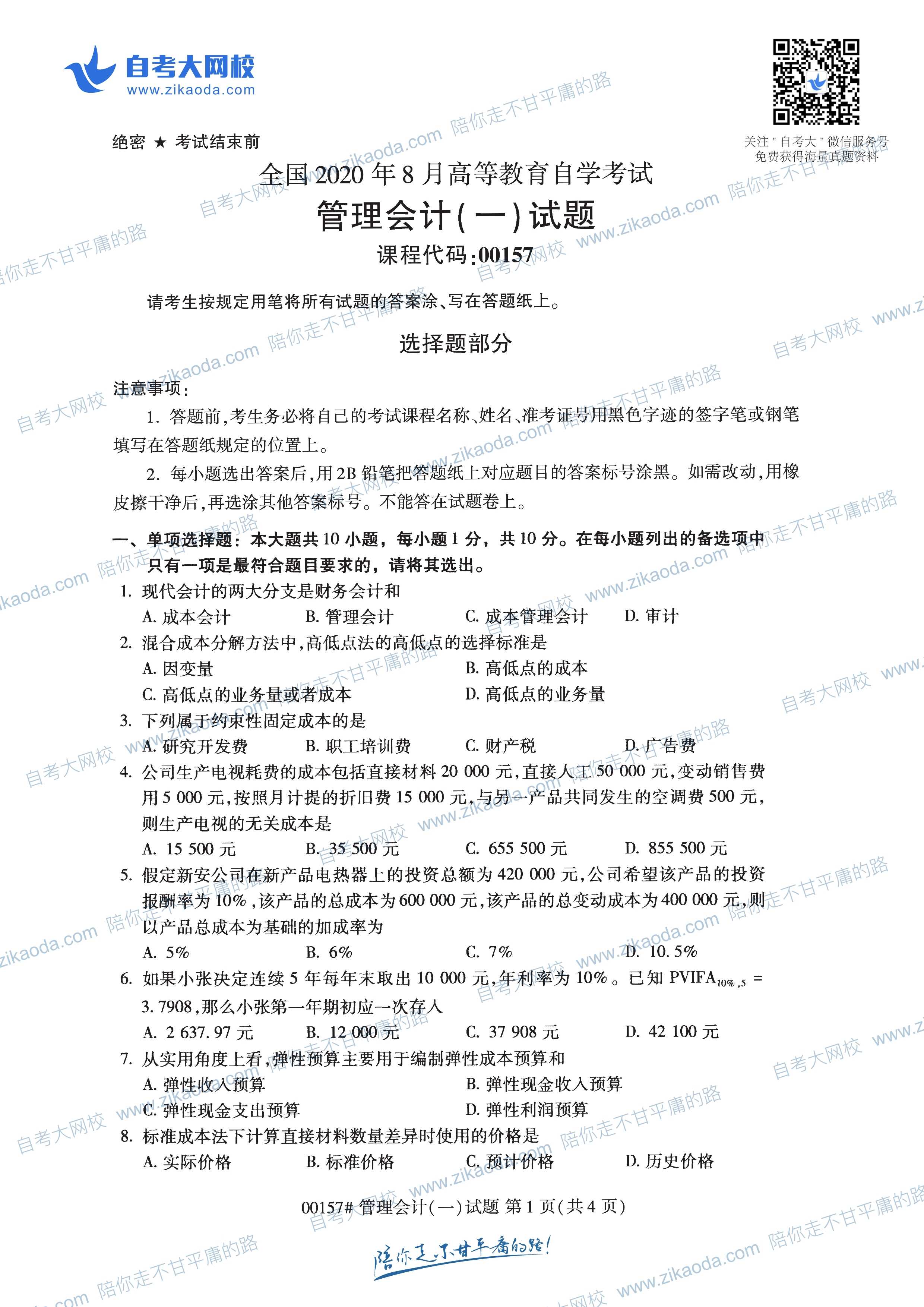 2022年10月全國(guó)自考00157管理會(huì)計(jì)(一)真題試卷已經(jīng)可以免費(fèi)下載,該試卷由江蘇自考網(wǎng)整理