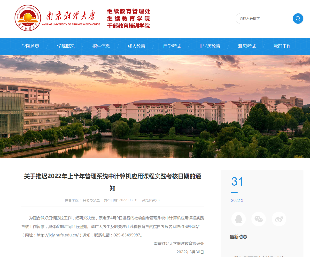 南京財經(jīng)大學關于推遲2022年上半年管理系統(tǒng)中計算機應用課程實踐考核日期的通知