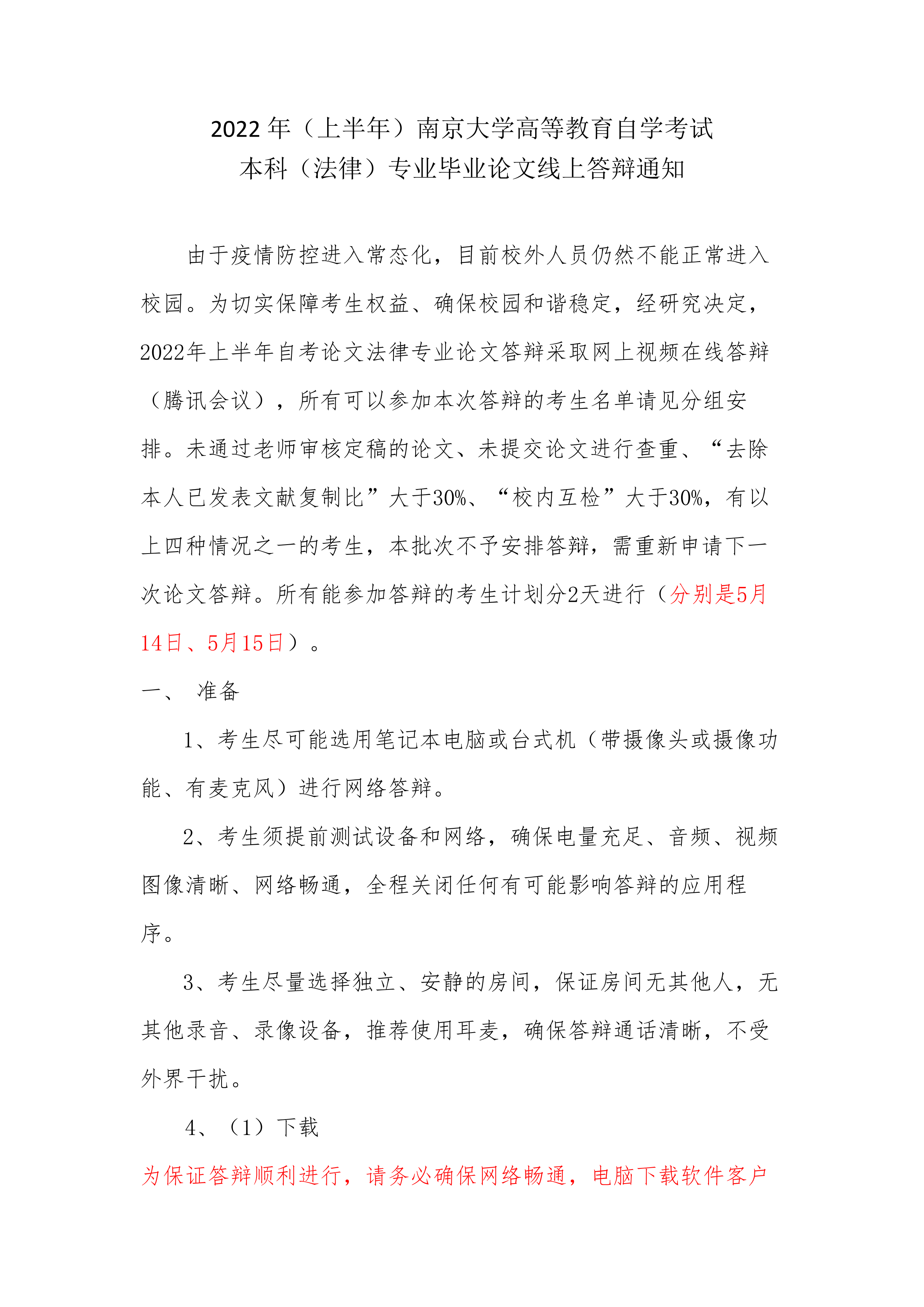 2022年(上半年)南京大學(xué)高等教育自學(xué)考試本科(法律)專業(yè)畢業(yè)論文線上答辯通知由于疫情防控進(jìn)入常態(tài)化,目前校外人員仍然不能正常進(jìn)入校園。為切實(shí)保障考生權(quán)益、確保校園和諧穩(wěn)定,經(jīng)研究決定,2022年上半年自考論文法律