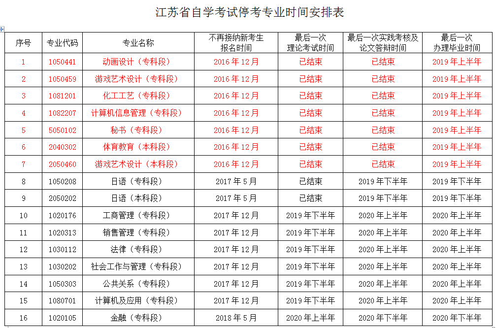 2020年江蘇省自考最新停考專業(yè)時間安排是?