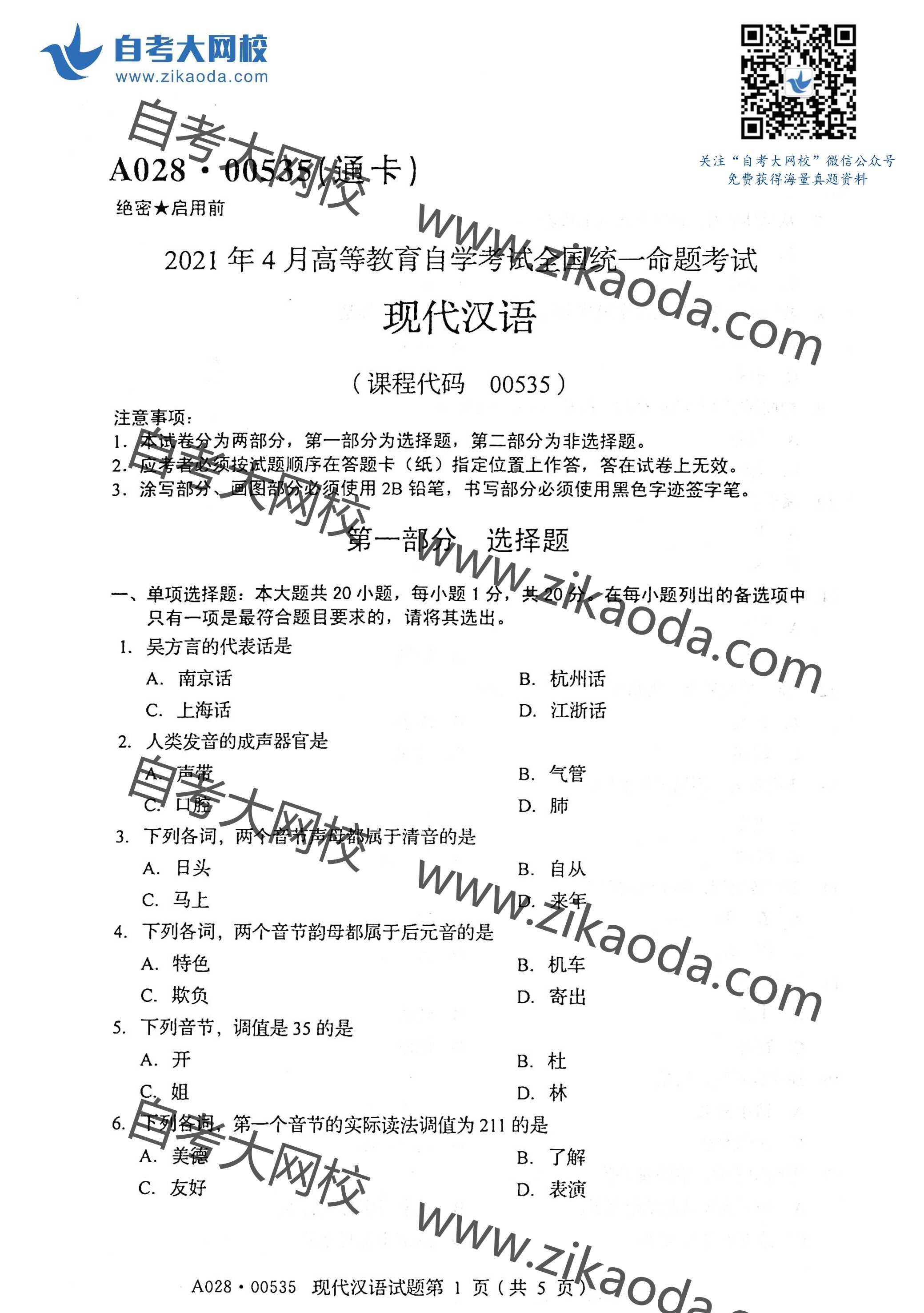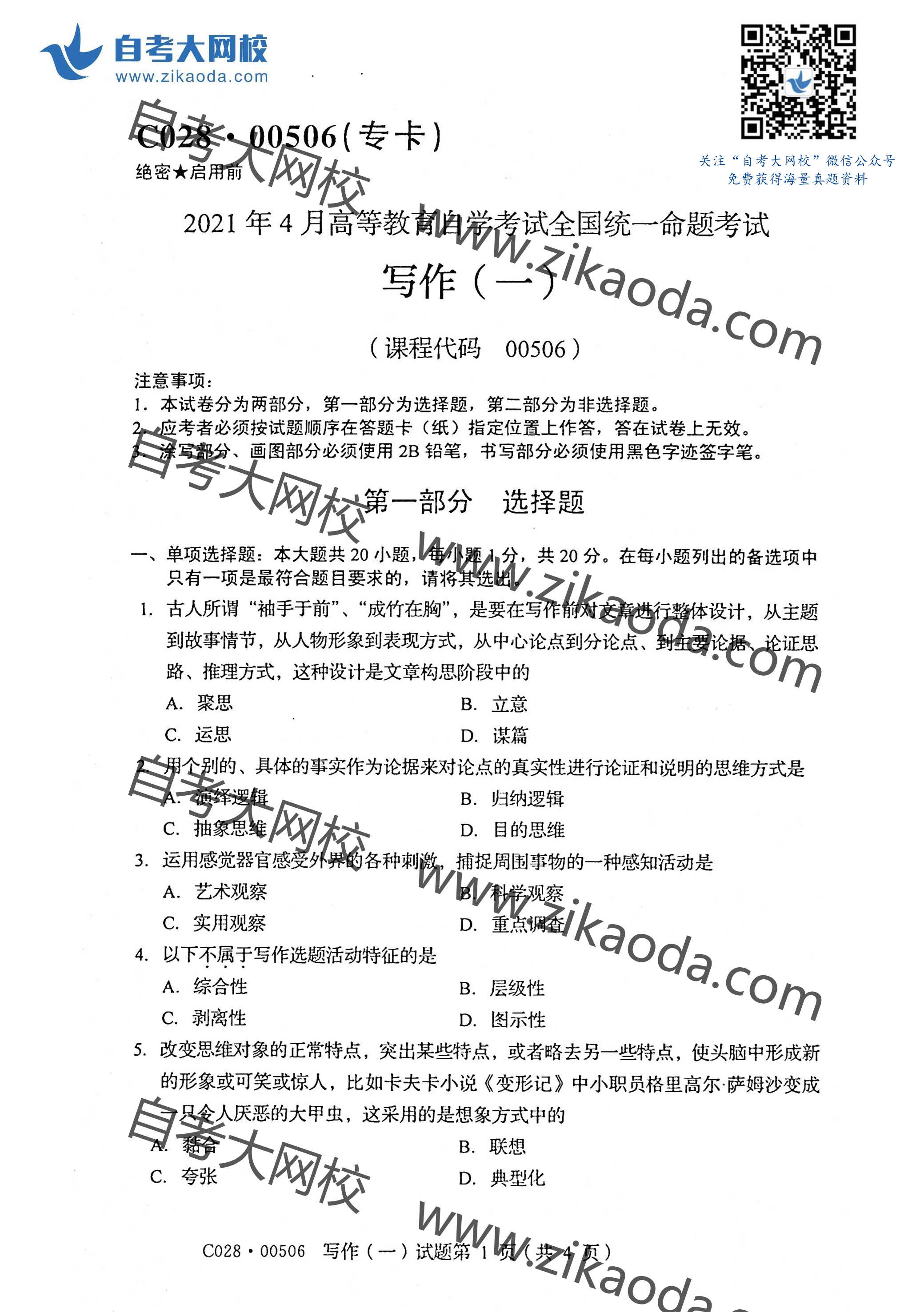 全國2021年4月自考00532中國古代文學(xué)作品選(一)真題試卷完整版試卷請聯(lián)系微信客服免費索取備注:4月自考試卷微信客服二維碼