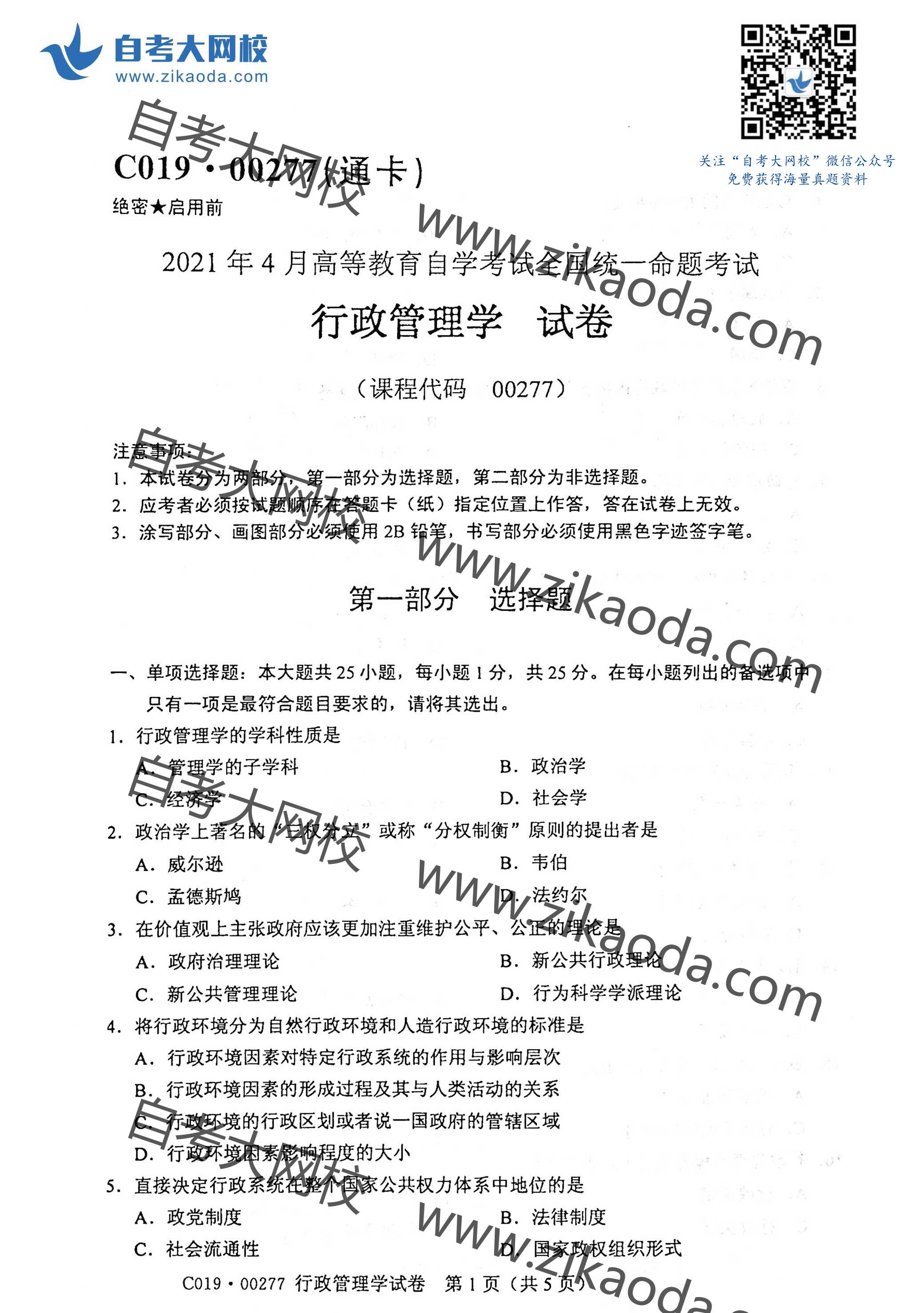 全國(guó)2021年4月自考00277行政管理學(xué)真題試卷完整版試卷請(qǐng)聯(lián)系微信客服免費(fèi)索取備注:4月自考試卷微信客服二維碼