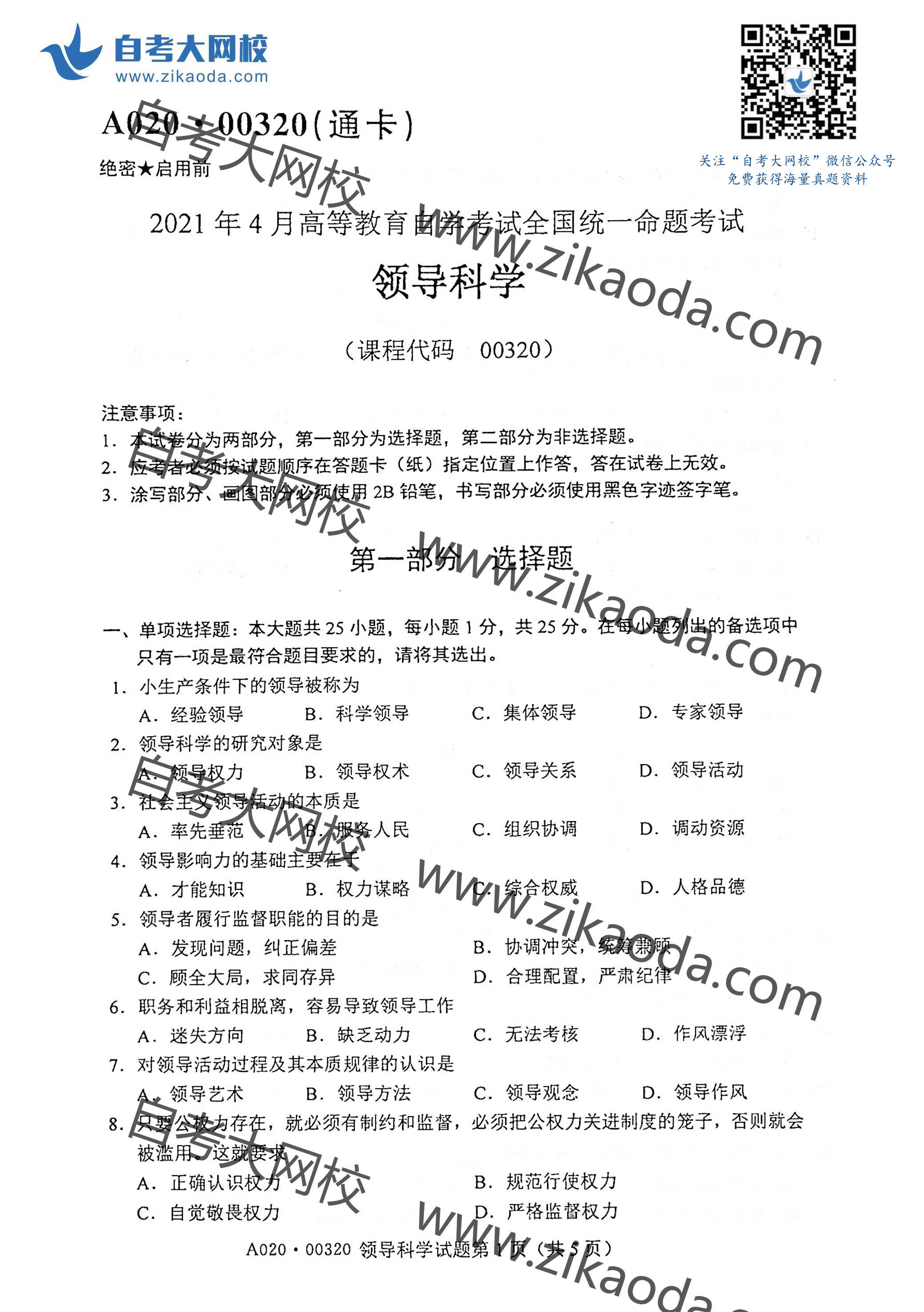 全國(guó)2021年4月自考00320領(lǐng)導(dǎo)科學(xué)真題試卷完整版試卷請(qǐng)聯(lián)系微信客服免費(fèi)索取備注:4月自考試卷微信客服二維碼