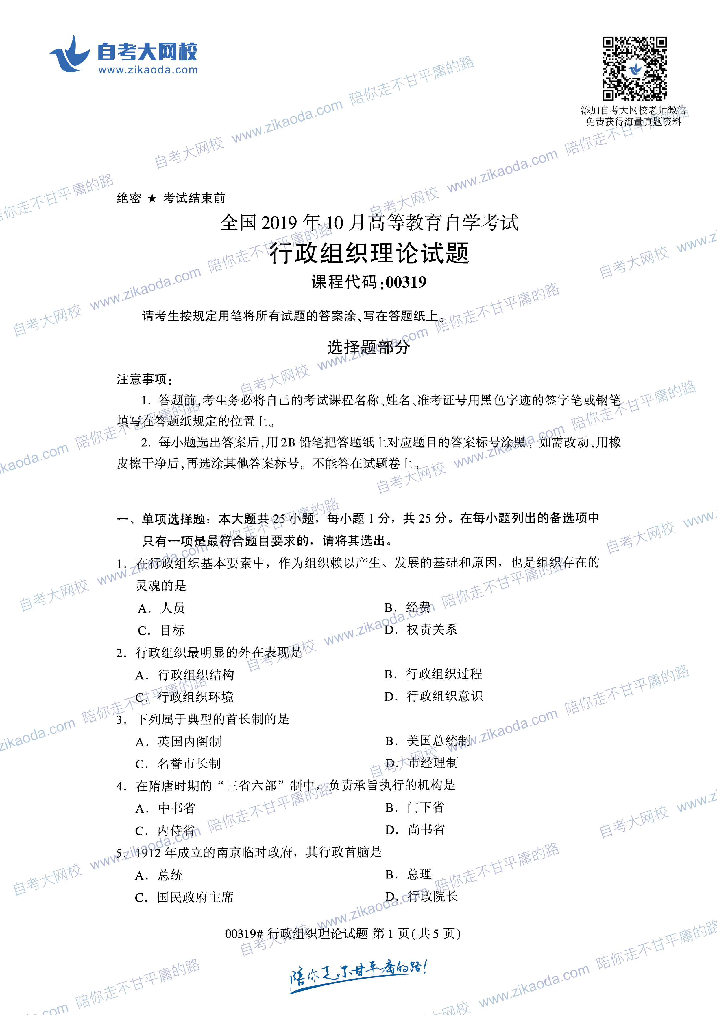 全國(guó)2021年4月自考00319行政組織理論真題試卷完整版試卷請(qǐng)聯(lián)系微信客服免費(fèi)索取備注:4月自考試卷微信客服二維碼